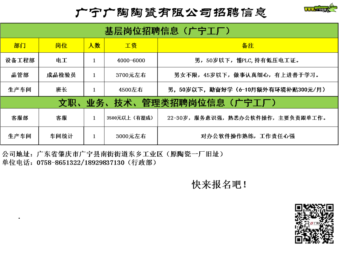 【3000-5000招聘】广宁广陶陶瓷有限公司诚聘跟班电工2名、成品检验员1名