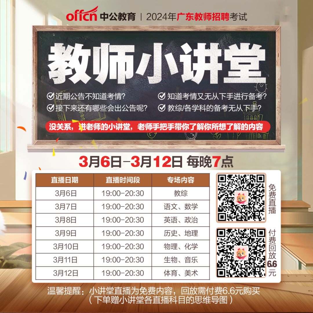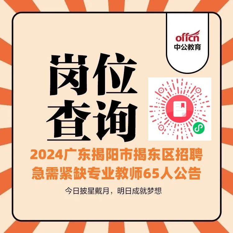 进群福利:⭐⭐⭐⭐⭐ 免费刷题,获取招聘资讯,上岸老前辈指点迷津,考编路上不孤单!不迷路! ![]() ![]() 2024广东揭阳市揭东区招聘急需紧缺专业教师65人公告根据《事业单位人事管理条例》(国务院令第652号)、《广东省事业单位公开招聘人员办法》(省人民政府令第301号)等有关规定,经区人民政府批准,区教育局计划招聘急需紧缺专业教师65名,现将有关事项公告如下。 一、招聘岗位 本次招聘急需紧缺专业教师共设48个岗位,招聘教师65名(其中高中教师32名、初中教师17名、小学教师13名、特殊教育教师3名)。具体的招聘单位、岗位、人数和资格条件详见《揭阳市揭东区2024年公开招聘急需紧缺专业教师岗位表》(附件1)。 二、招聘对象 报考特殊教育岗位的须为2024年国内普通高等院校应届本科毕业生并取得学士学位,其他岗位须具有研究生学历并取得硕士以上学位或普通高考原为第一批重点院校录取的专业且取得学士学位的2024年国内应届本科毕业生(非在职,毕业生均指纳入普通高校统一招生计划并通过普通高等教育毕业的毕业生)。 三、招聘条件 (一)报考人员应当具备下列条件 1.具有中华人民共和国国籍;遵守宪法和法律;拥护中国共产党领导和社会主义制度;具有良好的政治素质和道德品行;符合新时代中小学教师职业行为十项准则要求。 2.年龄:本科学历年龄在30周岁以下(1993年3月18日以后出生),研究生学历可放宽至35周岁以下(即1988年3月18日以后出生)。 3.具备与招聘岗位所要求的学历、学位和专业条件。报考人员所学专业必须与岗位要求的专业相符,同时符合中共揭阳市委组织部 揭阳市人力资源和社会保障局《关于印发〈揭阳市事业单位高层次和急需紧缺人才目录(第一批)〉的通知》(揭市人社规〔2023〕1号)(附件2)要求。专业名称及代码参考《广东省2024年考试录用公务员专业参考目录》(附件3)。 (1)岗位要求是六位代码的专业,则只有该专业符合岗位要求;岗位要求是四位代码的,则其相应的下一层级的六位代码的专业也符合要求。 (2)报考人员具有2个毕业证书和2个学位证书(4本证书),可选择符合报考要求的专业进行报考。本科期间辅修的专业无法取得教育部验证的,且没有单独毕业证和学位证的,则不能以辅修专业报考相应岗位。 4.具有与招聘岗位相应的学段和学科相应的教师资格(具有高级中学教师资格的可报考高中、初中、小学教师岗位;具有初级中学教师资格的可报考初中、小学教师岗位;具有小学教师资格的只能报考小学教师岗位;特殊教育教师岗位的须具有特殊教育学科教师资格)。 5.身体健康,具有良好的身体素质和心理素质,能胜任所应聘岗位的工作。 6.招聘公告要求的其他条件。 (二)下列人员不得报考 1.受过刑事处罚的。 2.被开除中国共产党党籍的。 3.被开除公职的。 4.被依法列为失信联合惩戒对象的。 5.聘用后即构成回避关系的。 6.在各级各类机关、事业单位招录(聘)考试、体检或考察中存在违纪行为的。 7.肄业生、在读的非应届普通高等学校毕业生和现役军人。 8.在编在岗的机关事业单位工作人员。 9.公费定向培养的高校毕业生。 10.法律、法规规定的其他情形。 四、薪酬待遇 获聘人员为事业单位正式在编人员,享受揭东区现行事业单位工作人员工资福利和招聘单位相关福利待遇,执行试用期相关规定。 五、招聘程序 招聘程序按发布公告、报名、资格审查、笔试、面试、签约、体检、考察、公示、聘用等环节进行。 (一)报名 1.报名时间:2024年3月18日8:30至3月22日17:00 2.报名方式:报名采用网上报名方式进行。考生通过扫描网上报名二维码(附件4)进行报名。考生须如实填写报名信息,并对所填信息的真实性、完整性及有效性负责。报名信息只能提交1次,请考生认真复核报名信息,确认无误后再提交。 (二)资格审查 1.资格审查时间:2024年3月25日上午8:30至11:30。 2.资格审查地点:揭阳市揭东区开放大学(教师发展中心)。 3.资格审查须提供以下材料: (1)《揭阳市揭东区2024年公开招聘急需紧缺专业教师报名表》(附件5,一式两份)。 (2)教育部学籍在线验证报告(在学信网上下载打印一式一份)。 (3)学业成绩表、学生证(原件,复印件一式一份)。 (4)有效的居民身份证(原件,复印件一式一份)。 (5)已取得教师资格的,提供教师资格证;未取得教师资格的,须提供有效期内的中小学教师资格考试合格证明或笔试合格成绩(即“中小学教师资格考试NTCE成绩”)和普通话水平测试等级证书(二级乙等及以上)(原件,复印件一式一份)。 4.报考注意事项 (1)经网上报名后未到现场参加资格审查的视同放弃。每人只准报考一个职位,不得兼报。经资格审查合格后发给准考证,按规定时间参加考试。 (2)证书、证明材料提交原件及复印件的,待查验后退回原件。 (3)资格审查贯穿招聘全过程。考生须诚信报名、诚信考试。凡提供虚假报考申请材料的,一经查实,即取消报考人员报名资格或者聘用资格。对伪造、变造有关证件、材料、信息,骗取考试资格的,将按有关规定予以处理。涉嫌犯罪的,移送司法机关处理。 (4)岗位要求的其他资格条件(如学历、学位、教师资格等)均应在2024年8月31日以前取得,时间以证书落款日期为准。 (三)考试及计分办法 1.考试时间及地点 (1)笔试时间:2024年3月26日上午9:00—10:30; 笔试地点:揭阳市揭东区开放大学(教师发展中心