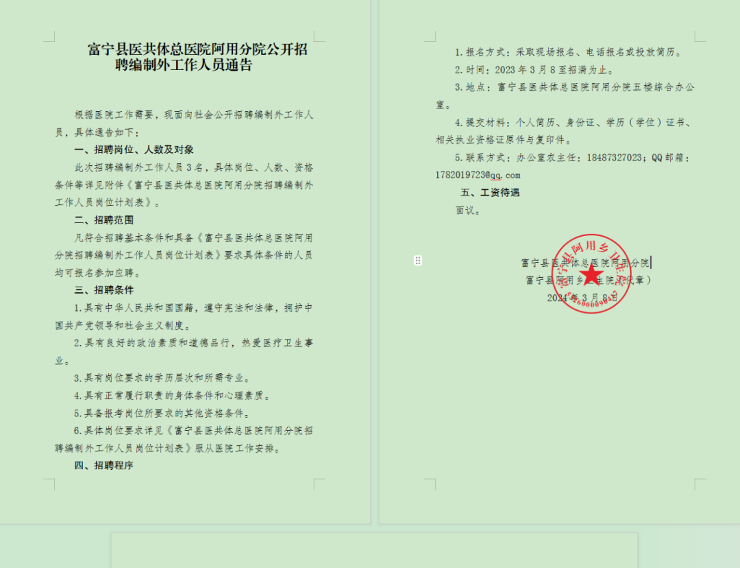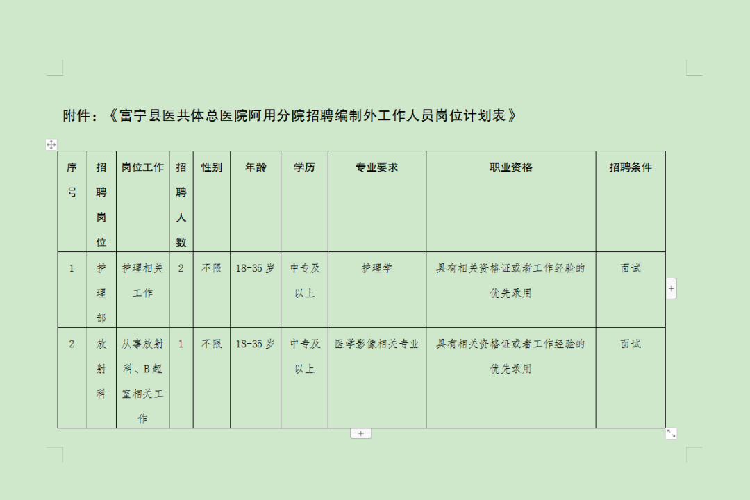 此次招聘编制外工作人员3名,具体岗位、人数、资格条件等详见附件《富宁县医共体总医院阿用分院招聘编制外工作人员岗位计划表》。