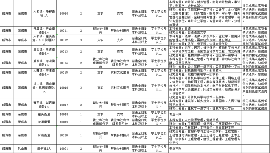 ![]() 30周岁(含)以下(1992年6月8日以后出生)山东省内普通高校全日制毕业生以及省外普通高校和国家承认学历的海外高校全日制大学的山东户籍毕业生(含2017年以后的非全日制研究生)。各市可根据岗位特点和基层实际需求适当将部分岗位学历要求放宽到专科、适当放宽专业条件、不设开考比例。对省委组织部等11部门《关于印发<关于鼓励引导人才向基层流动的若干意见>的通知》(鲁组字〔2019〕32号)明确的重点扶持区域、乡村振兴重点帮扶县和《山东省人民政府关于印发突破菏泽鲁西崛起三年行动计划(2023-2025年)的通知》(鲁政字〔2023〕18号)中菏泽、枣庄、德州、聊城、滨州5市,可按不低于50%比例面向本地户籍或本地生源高校毕业生招募。高级技工学校、技师学院全日制毕业生,毕业时取得高级工、预备技师(含技师)职业资格(职业技能等级)的,可以按照有关规定应聘符合条件的岗位。 东营市、日照市、德州市支医岗位具体招募方式,按照2023年东营市、日照市、德州市高校毕业生“三支一扶”计划招募补充公告实施。 (一)理想信念坚定,对党忠诚、品德优良、遵纪守法、作风踏实,组织纪律观念强;志愿到基层工作,服务乡村振兴,服从组织安排。 (二)专业知识扎实,具有相应学制的毕业证书和学位证书;组织协调能力、分析解决问题能力和语言文字表达能力较强,有发展潜力,综合表现比较突出。 (三)具有中华人民共和国国籍,年满18周岁(2005年6月8日以前出生)。 (四)身体健康,符合相关体检标准。 (五)具有下列情况之一的人员,不得报考: 1.曾受过刑事处罚和曾被开除公职的人员; 2.在读全日制普通高校非应届毕业生; 3.现役军人; 4.曾被“三支一扶”计划录取过的人员; 5.具有法律法规规定不得被聘用为事业单位人员的其他情形的。 (六)其他事项 1.最高学历学位高于岗位条件要求,相应专业条件符合岗位规定的可以报考。在读全日制普通高校非应届毕业生不得用已取得的学历学位作为条件报考。 2.报考人员不得报考有《中共中央组织部 人力资源社会保障部关于印发<事业单位人事管理回避规定>的通知》(人社部规〔2019〕1号)规定情形的岗位。 3.符合各市对岗位需求、专业及其他条件作出的补充公告。考生专业情况以毕业证书上注明的专业为准。 4.报考人员报考前须认真阅读本公告及各市补充规定。 报名时间:2023年6月8日9:00—6月12日16:00 查询时间:2023年6月8日11:00—6月13日16:00 (点击查看大图) 来源:山东高校毕业生就业信息网 ![]() |
