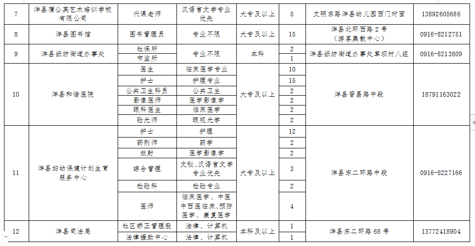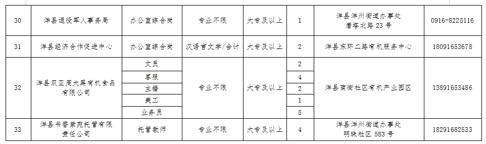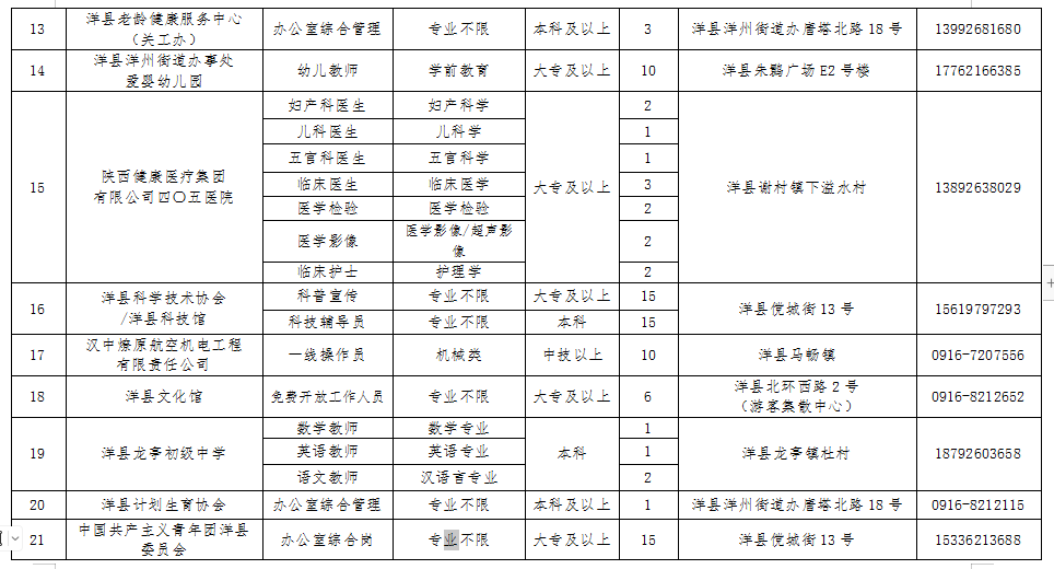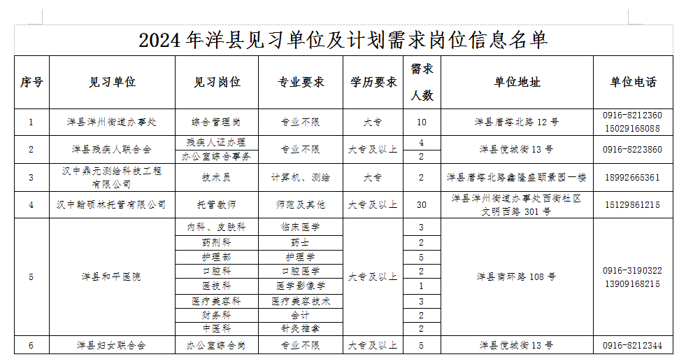为贯彻落实国家及省、市有关普通高校毕业生就业创业工作的各类会议精神,进一步做好高校毕业生等青年群体就业见习工作,帮助其通过见习岗位实践锻炼,提升就业能力,依据《陕西省就业见习管理办法》(陕人社发[2019]51号)文件政策规定,现将2024年面向社会公开征集的第一批33家就业见习单位和计划需求岗位信息予以公告。 凡符合见习条件且有见习意愿的普通高校毕业生(毕业年度及毕业两年内未就业)和失业青年(16—24岁以内),可与公布的见习单位或县人才交流服务中心联系参加就业见习,并享受国家给予的就业见习补助。欢迎符合条件的高校毕业生等青年积极参加就业见习。 地址:洋县真符路6号人力资源大厦北五楼人才交流服务中心 联系电话:0916-2938705
