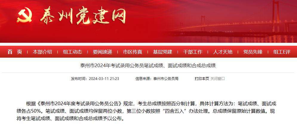 根据《泰州市2024年度考试录用公务员公告》规定,考生总成绩按照百分制计算,具体计算方法为:笔试成绩、面试成绩各占50%。笔试成绩、面试成绩均保留两位小数,第三位小数按照“四舍五入”办法处理。总成绩保留原始计算数值。现将考生笔试成绩、面试成绩和合成总成绩予以公布。附件:泰州市2024年考试录用公务员笔试成绩、面试成绩和合成成绩.xlsx