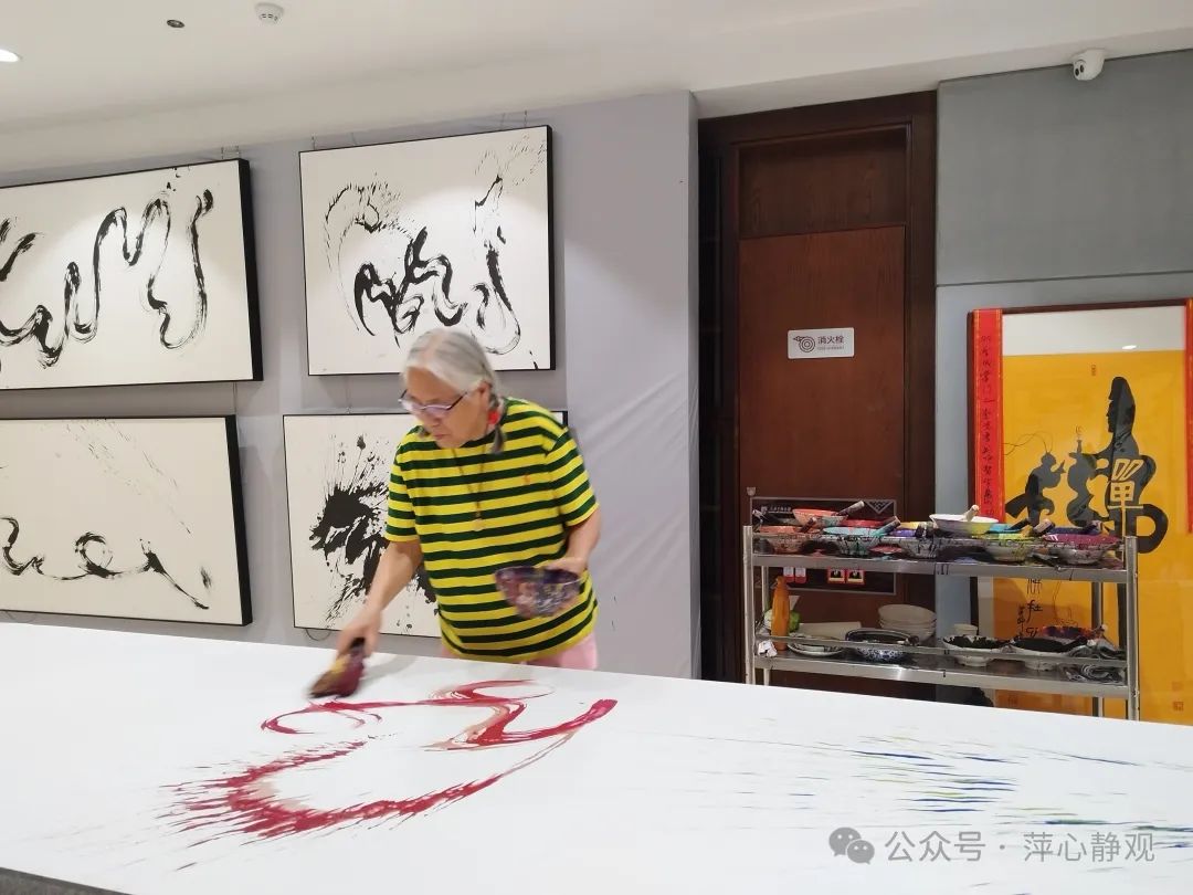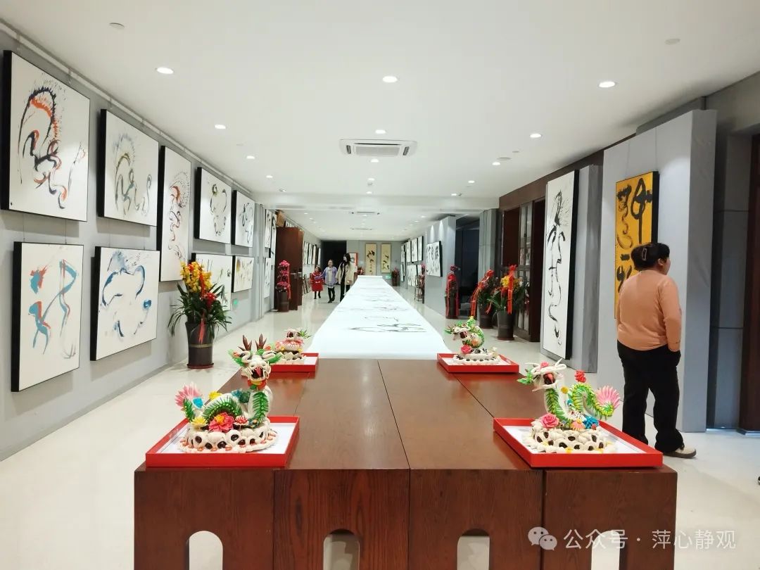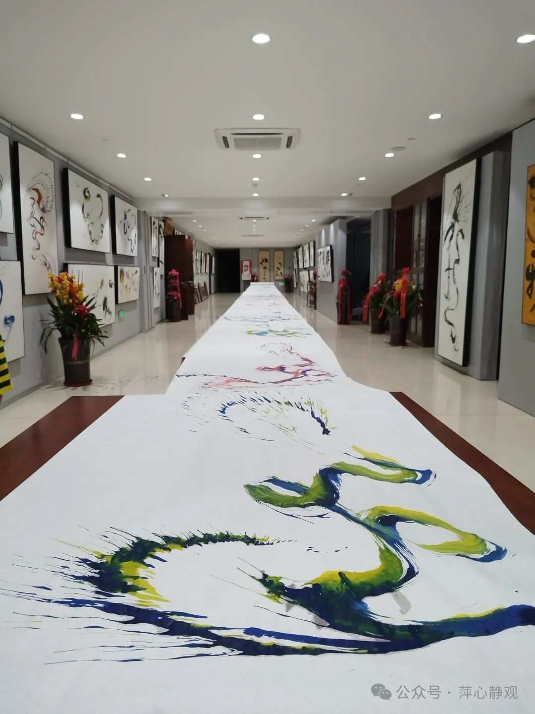 交谈甚欢时,辫子姐姐随手拿起二把锅刷,经过挥、甩、泼、打、顿、拖。顿时一幅神龙便飞在纸上,辫子姐姐将其命名为《晋龍》,赠与我们团队。