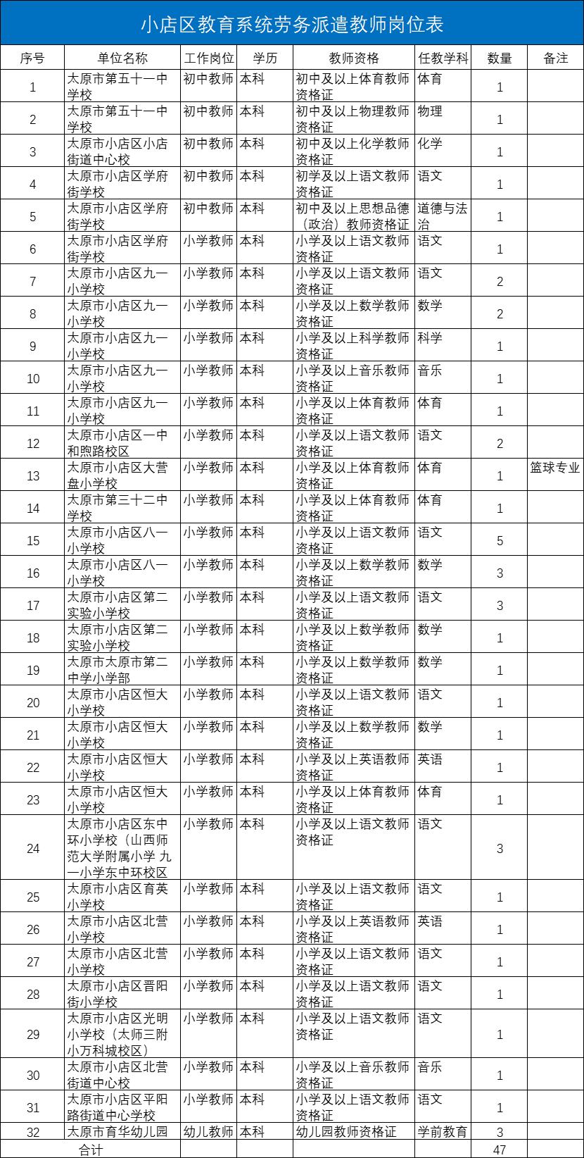 为促进小店区教育事业健康发展,进一步优化教师队伍结构,切实解决太原市小店区部分学校教师短缺问题,现面向社会公开招聘教师47名,现将有关事项公告如下: