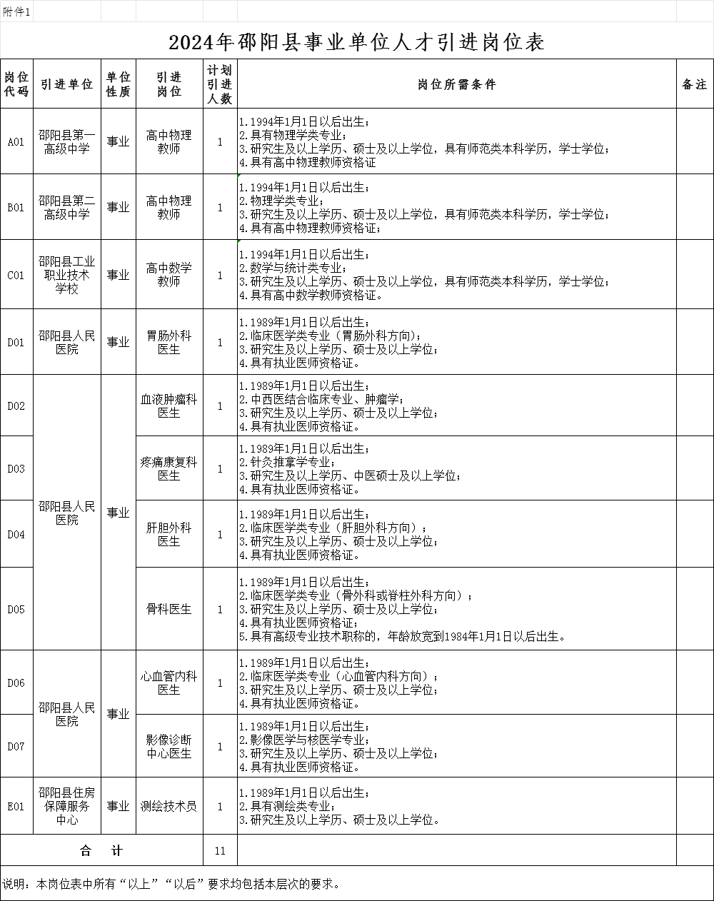 本次人才引进计划共计11名,具体引进岗位、计划引进人数及岗位所需条件详见《2024年邵阳县事业单位人才引进岗位表》(附件1)。