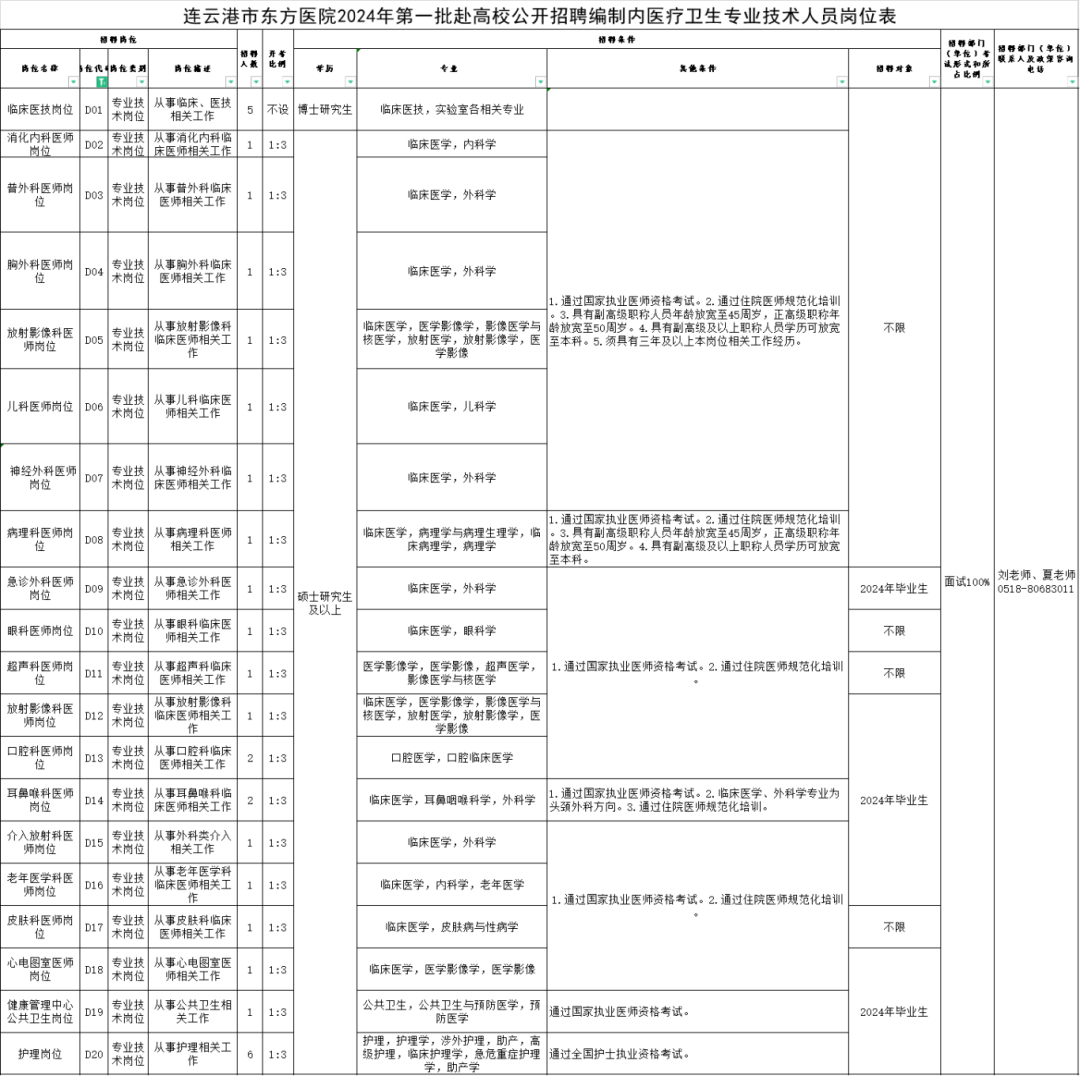 各招聘单位政策咨询电话详见《岗位表》。连云港市卫生健康委员会组织宣传处:0518-85820163。