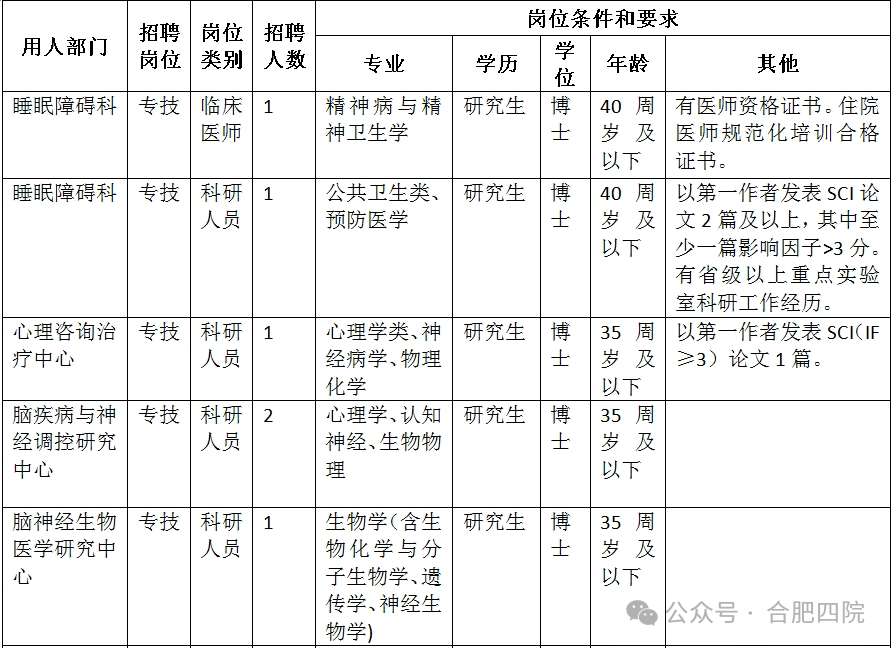 合肥市第四人民医院(安徽省精神卫生中心)根据工作需要,现面向社会公开招聘工作人员65人、面向社会公开引进博士及急需紧缺人才。
