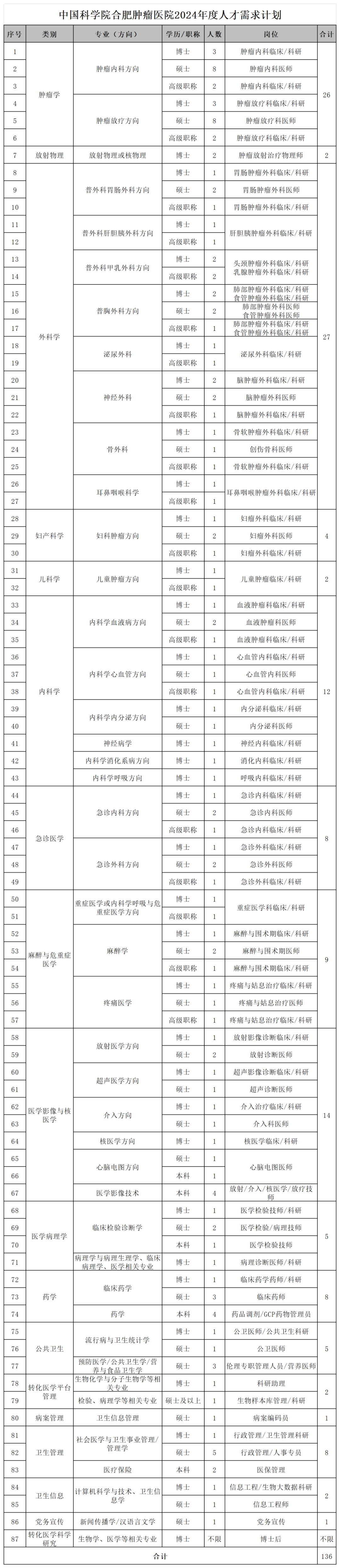 中国科学院合肥肿瘤医院根据医院发展规划,现面向全社会公开招聘以下专业技术人才。