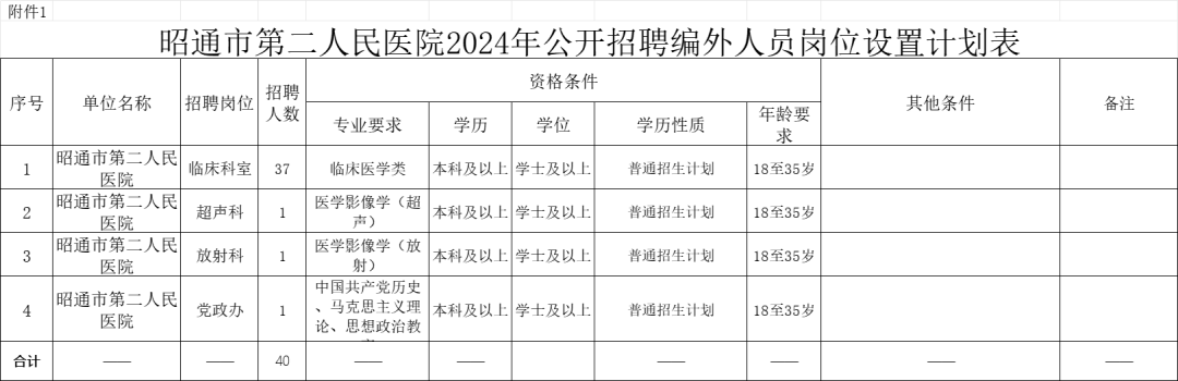 具体招聘岗位、职数详见《昭通市第二人民医院2024年公开招聘编外人员岗位设置计划表》(附件1)。