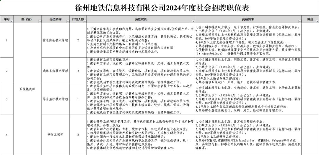 4. 徐州地铁信息科技有限公司2024年度社会招聘公告