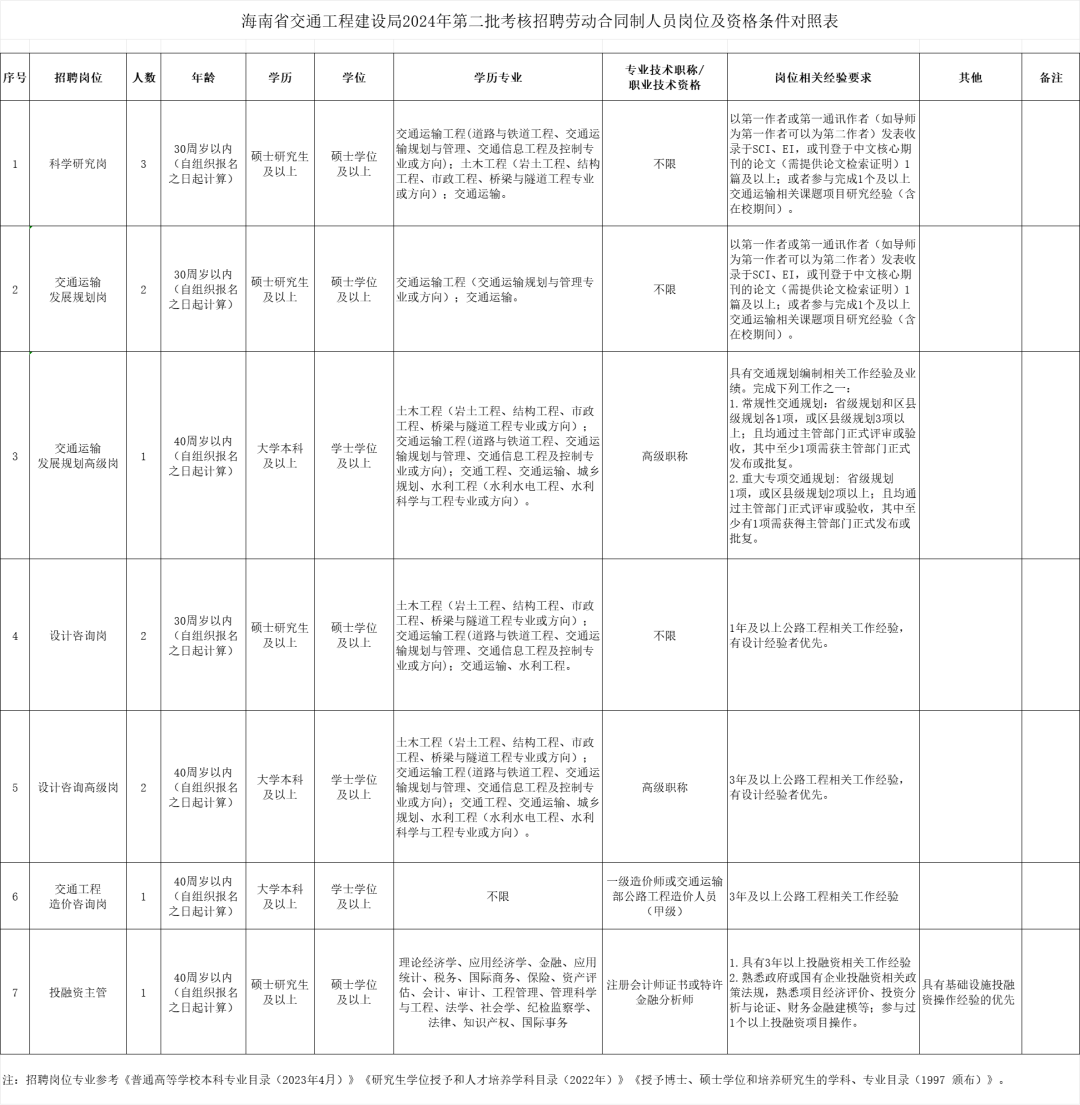 1.海南省交通工程建设局2024年第二批考核招聘劳动合同制人员岗位及资格条件对照表