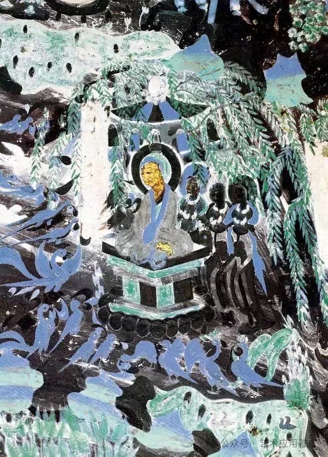 敦煌壁画中的花树既有传统绘画中常见的花树形象,也有从印度传入的花树形象。如银杏、芒果就属于佛教中的圣树,这些花树形态又与起源于古印度的佛教信仰紧密相连。
