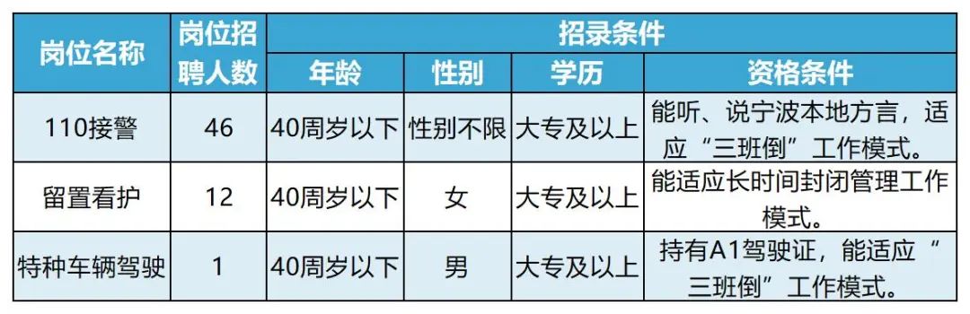 因工作需要,宁波市公安局面向社会公开招聘警务辅助人员(以下简称辅警)59名。