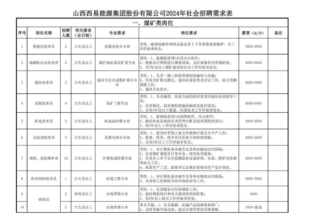 朔州招聘号,朔州招聘,朔州招聘求职的好平台。每日发布考试信息、招聘会、行业动态、人事行政、职场干货、客服、财务销售、快递员、送餐员、外卖员、司机、汽车维修、护理、房产中介、餐饮招聘、普工、保洁、保姆月嫂等工作招聘信息,欢迎您的关注!山西西易能源集团股份有限公司位于山西省朔州市平鲁区白堂乡西易工业园区,成立于1998年,下设三座煤矿、七个运销企业、十二个地面企业。全集团总注册资金5.8亿元,固定资产总额40多亿元,在册人员2642人。近年来,公司与时俱进、开拓创新,发挥主导产业优势,积极延伸煤炭产业链,大力实施产业结构调整,走可持续发展道路。公司基本上形成了煤业为主、多业并举,煤炭产、洗、运、销一体化的产业格局。 1、报名人员要遵守国家宪法、法律和法规,具备良好的职业道德和敬业精神,作风正派;4、报名人员提供资料必须真实有效,不得弄虚作假,一经查实,即取消应聘或录用资格。 二、报名方式及时间