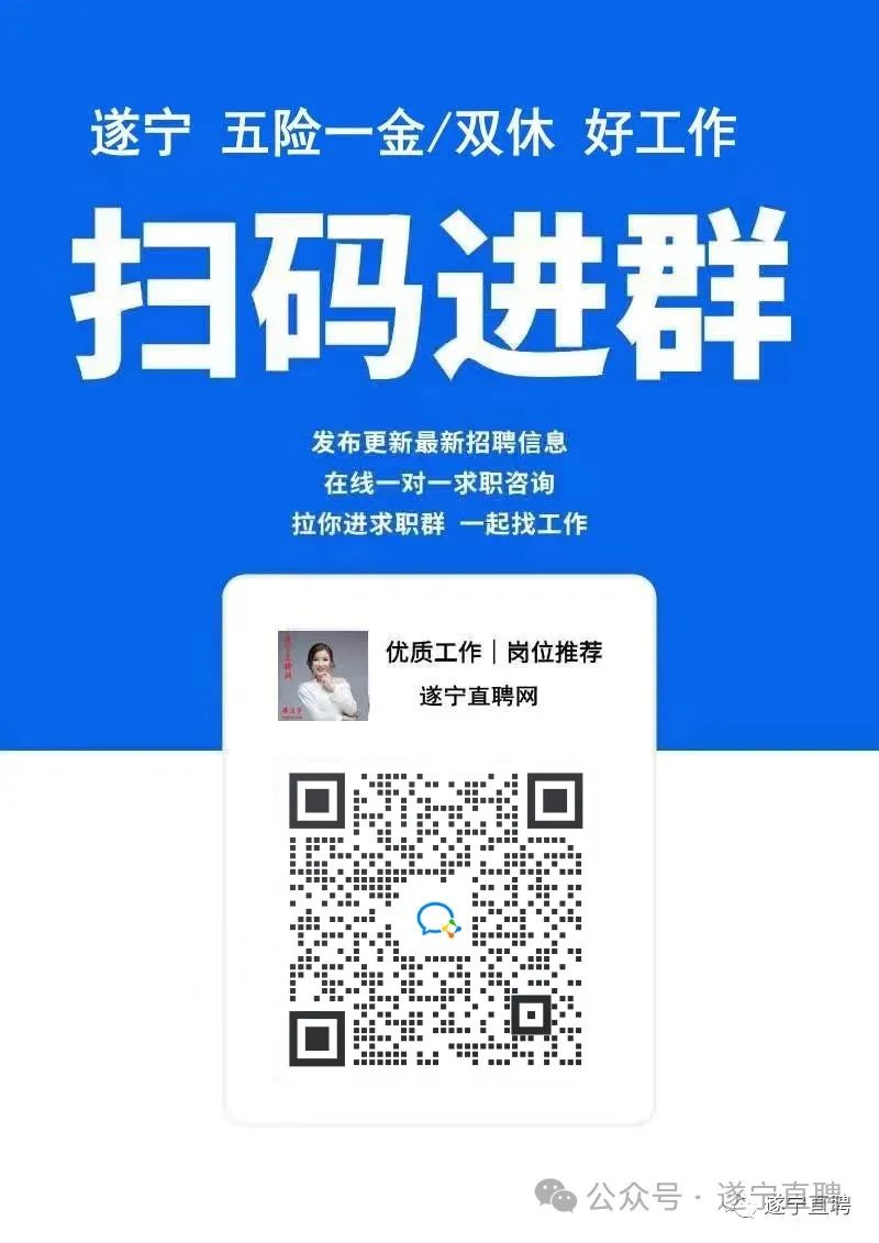 普工(五险+包吃住) 5000-6000元/月 五险|加班费|免费培训|晋升空间|绩效奖金|全勤奖|餐补 华弘锐工具有限公司 操作半自动数控设备或全自动设备,在生产过程中进行抽验检...... 长按识别二维码,了解更多 华润漆销售(五险+带薪年假14天+法定节假日+话补) 3500-7000元/月 五险|年终奖|月休4天|早九晚六|节日福利|生日福利|免费培训|晋升空间|绩效奖金|环境好|交通方便|管理规范|有提成|国家法定节假日|话补 遂宁虎虎虎商贸有限公司 岗位:销售 工资:3000-7000 上班时间:08:...... 长按识别二维码,了解更多 线上运营(底薪+提成+奖金+包吃) 3000-8000元/月 长白班|年终奖|月休4天|晋升空间|绩效奖金|管理规范|有提成 遂宁极好华建材有限公司 岗位职责: 线上销售,协助主播完成线上直播相关事宜,经...... 长按识别二维码,了解更多 普工 蓬溪,船山(购买六险) 3000-6000元/月 公积金|五险 浙江东冠通信技术股份有限公司遂宁分公司 一、工作内容: 负责中国移动遂宁地区通信设...... 长按识别二维码,了解更多 面包车快递员(自带面包车/五险+综合6000以上+带薪年假) 5000-9000元/月 五险 全程德邦快递 公司统招,无任何费用!!自带面包车,有车补油补,车补7...... 长按识别二维码,了解更多 招聘顾问,月薪4000- -12000(社保+月休6天,) 4000-12000元/月 双休|五险|早九晚六|节日福利|生日福利|免费培训|晋升空间|有提成 遂宁直聘网 职位描述 【岗位内容】 1. 负责电话联系遂宁本地企业...... 长按识别二维码,了解更多 迎宾接待(包吃住+综合5000) 3000-5000元/月 包食宿|年终奖|月休4天|节日福利|生日福利|免费培训|晋升空间|绩效奖金|环境好|交通方便|管理规范|有提成|全勤奖 新河东酒店 岗位福利: 包吃住+年终奖+免费培训+生日福利+节日福...... 长按识别二维码,了解更多 业务员(五险一金+综合1万以上+提成) 5000-10000元/月 长白班|公积金|五险|年终奖|节日福利|生日福利|晋升空间|绩效奖金|环境好|交通方便|管理规范|有提成 承扬建筑装饰工程有限公司 岗位福利: 五险一金+底薪3000+综合1万+提成+年...... 长按识别二维码,了解更多 采耳师(包吃住+月休4天+有无经验均可) 4500-10000元/月 包食宿|加班费|月休4天|节日福利|免费培训|环境好|交通方便 川耳堂保健馆 职位描述: 用我们学到的技术服务好每一位顾客 联系我...... 长按识别二维码,了解更多 美甲师美睫师(八小时+员工生日假) 3000-6000元/月 月休4天|生日福利|免费培训|晋升空间|环境好|交通方便|有提成|话补|餐补 口袋里美甲 岗位职责:美甲美睫师 工作态度: 能够热情 完整清晰的...... 长按识别二维码,了解更多 服务员(底薪3000+包吃住+提成+月休3天+转介绍奖) 3500-7000元/月 年终奖|免费培训|晋升空间|包吃|绩效奖金 遂宁市河东新区玺悦台音乐餐吧 岗位要求: 负责店里服务接待,辅助点餐工作 年龄23-...... 长按识别二维码,了解更多 家具销售/无需自带客源(五险+年终奖+绩效奖金+提成) 4500-8000元/月 五险|年终奖|月休4天|早九晚六|绩效奖金 LAZBOY乐至宝沙发 岗位福利: 五险+年终奖+绩效奖金+提成+季度奖金+销...... 长按识别二维码,了解更多 贷款专员(综合8000以上+双休+绩效奖金+年终奖) 2000-20000元/月 双休|五险|年终奖|月休4天|早九晚六|节日福利|生日福利|免费培训|绩效奖金|环境好|交通方便|有提成|国家法定节假日|全勤奖 鑫焱企业管理公司 薪资待遇: 2000(无责底薪)—10000(上不封顶...... 长按识别二维码,了解更多 烧烤工(包吃住+综合5000) 4000-5000元/月 包食宿|节日福利|生日福利 烙锅烧烤 岗位福利: 包吃住+月休2天+节日福利 上班时间:...... 长按识别二维码,了解更多 收银员/迎宾(包吃住+综合4800+旅游) 3000-4800元/月 包食宿|年终奖|早九晚六|节日福利|生日福利|免费培训|包吃|绩效奖金|交通方便|管理规范|有提成|全勤奖|优秀员工旅游 忠辉华府汤王 岗位福利: 基本工资+酒水提成+全勤+工龄工资+绩效奖...... 长按识别二维码,了解更多 南门店营业员(上半天+社保) 3000-6000元/月 加班费|生日福利|免费培训|晋升空间|绩效奖金|环境好|有提成 四川邓酥记餐饮管理有限公司 岗位描述: 负责门店的日常运营工作。为顾客提供温馨舒适...... 长按识别二维码,了解更多 KTV服务员(底薪3500+综合6000+包吃住+试用期全额+定期团建) 3500-6000元/月 包食宿|节日福利|生日福利|免费培训|包吃|有提成 遂宁市拉法KTV (不要寒假工,需要全职) 岗位福利: 试用期全额+包吃...... 长按识别二维码,了解更多 服务员(底薪+全勤+提成+上一休一+女性优先) 3000-3500元/月 节日福利|有提成 临君咖啡 1、上班地点:河东五彩之心临君咖啡。 2、上班时间:9...... 长按识别二维码,了解更多 服务员(包吃+8小时工作+提成) 3000-4000元/月 年终奖|节日福利|生日福利|免费培训|晋升空间|环境好|交通方便|有提成|国家法定节假日 杨仙玉餐饮服务有限公司 岗位要求: 负责店面客户接待,和点餐等服务工作 年龄2...... 长按识别二维码,了解更多 电销顾问(五险+综合8000) 3000-8000元/月 月休4天|早九晚六 盛翔聚鑫电脑软件服务部 薪资待遇: 无责底薪3000+提成,不加班+综合800...... 长按识别二维码,了解更多 业务员(五险+底薪4000+提成) 5000-10000元/月 五险|节日福利|晋升空间|有提成 四川泡泣洁有限公司 岗位内容: 负责餐饮,商超,批发方面的产品上架 岗位要...... 长按识别二维码,了解更多 普工 (包吃住+五险+节假日