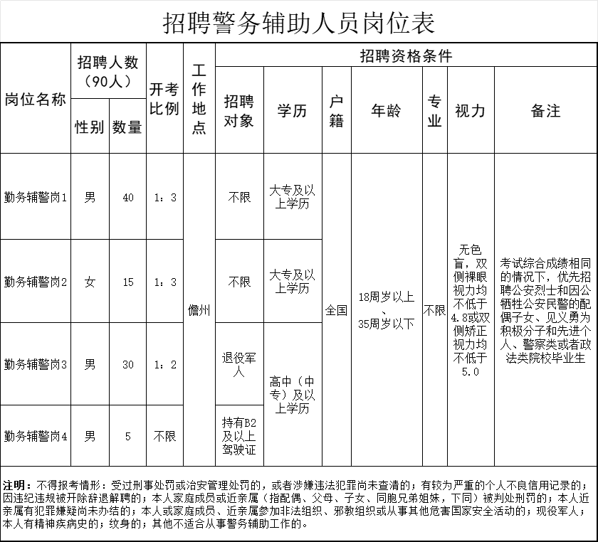 儋州市公安局2024年关于公开招聘警务辅助人员公告(2024年第1号) 因工作需要,儋州市公安局委托第三方劳务派遣公司面向社会公开招聘一批警务辅助人员(以下简称辅警),安排到交警、特警、基层派出所等部门工作。现将有关事项公告如下: 一、招聘人数、岗位及主要职责 (一)招聘人数及岗位:共90名(具体岗位详见附件1),工作地点为儋州市各镇。 (二)工作职责:协助民警开展日常接处警、道路交通管理、社会面巡逻防控、维稳处突、基层派出所基础工作、执行留置看护任务等。 二、辅警身份性质 辅警是在公安机关及其人民警察的指挥和监督下履行辅助性警务职责,由公安机关管理使用,不具有人民警察和事业编制人员身份的工作人员。 三、招聘基本资格条件 (一)应聘者应当具备以下条件: 1.具有中华人民共和国国籍; 2.拥护中国共产党领导和社会主义制度; 3.拥护中华人民共和国宪法,遵守国家法律法规,品行端正; 4.身体健康,吃苦耐劳,遵守工作纪律、保守工作秘密,服从组织安排和集中封闭管理,能够适应经常值夜班及轮班工作; 5.年龄为18周岁以上、35周岁以下(1988年3月13日至2006年3月12日期间出生); 6.报名时间截止前取得国家承认的毕业证书; 7.具有符合报考岗位要求的其他资格条件; 8.法律规定的其他条件。 (二)有下列情形之一的,不得报考: 1.受过刑事处罚或治安管理处罚的,或者涉嫌违法犯罪尚未查清的; 2.有较为严重的个人不良信用记录的; 3.因违纪违规被开除、辞退、解聘的; 4.本人家庭成员或近亲属(指配偶、父母、子女、同胞兄弟姐妹,下同)被判处刑罚的; 5.本人近亲属有犯罪嫌疑尚未办结的; 6.本人或家庭成员、近亲属参加非法组织、邪教组织或从事其他危害国家安全活动的; 7.现役军人; 8.本人有精神疾病史的; 9.纹身的; 10.其他不适合从事警务辅助工作的。 在招聘过程中,发现报考人员存在上述不得报考情形的,将取消报考资格或者聘用资格。 四、招聘程序 招聘程序分为网上报名、资格审查、笔试、体能测评、计算机基础能力测试、面试、体检、考察、公示、聘用环节。 (一)报名 1.报名时间:2024年3月13日上午8:00至3月19日中午12:00止。 2.报名方式:本次招聘采取网上报名方式进行,网上报名包括提交报考申请、上传照片等报考资料、查询报名资格审查结果、打印准考证等环节。报名后应及时登录儋州市公安局政务信息公开栏(网址:https://www.danzhou.gov.cn/danzhou/zfxxgkzl/bm/gaj/gkml/)或儋州警方微信公众号了解招聘工作进展情况和有关事项的公告,并保持报名时登记的联系方式畅通。 3.报名程序: (1)提交报考申请。报考人员在报名规定时间内登录网址http://zk.zegongyi.com/index.php/exam/?EXAMID=6233,点击“考生由此进入”进行注册报考,设置个人密码,如实填写报考信息,提交报考申请。报考人员只能选择1个岗位报名。报名必须使用本人有效期内的二代身份证,报名与考试时使用的身份证必须一致。未能在规定时间内完成以上报名步骤的,视为放弃报名资格。用户名和个人密码是查询资格审查结果、下载打印准考证等事项的依据,报考人员务必牢记。 (2)上传照片等报考材料。网上报名时,报考人员应上传以下资料: ①身份证正反面; ②户口本(户主页及本人页)或户籍证明; ③毕业证(最高学历,高中、中专学历的需上传毕业证书或学校出具的毕业证明); ④学信网学历认证材料(带有效期内二维码标识的教育部学历证书电子注册备案表,高中或中专学历无需提供,境外留学人员需提供教育部留学服务中心认证书); ⑤本人近期正面免冠证件照片(2寸jpg格式,50KB以下); ⑥退役军人报考的,需按要求上传退役证书或原服役部队(团级以上)出具的加盖公章的退役证明等材料; ⑦报考岗位表中“勤务辅警岗4”的,需按要求上传B2及以上驾驶证; ⑧报考人员诚信承诺书(需下载附件2由本人亲笔签名捺印后上传); 点击下载👉:报考诚信承诺书.docx ⑨其他应提交材料。 以上材料均以电子图片(jpg格式)的形式通过报名系统上传,并点击提交。 本次招聘实行诚信报名制度。报考人员要仔细阅读诚信承诺书、招聘岗位表等,根据个人情况报考符合条件的岗位,按要求真实、全面、准确填写相关信息。报考人员提供虚假报考材料的,一经查实,立即取消报考资格。对伪造、变造有关证件、材料、信息,骗取考试资格的,将按照国家有关规定严肃处理。考生应当结合自身情况报考,不得报考聘用后构成回避关系的招聘岗位(公安机关民警的配偶、直系血亲关系、三代以内旁系血亲关系以及近姻亲关系的,不得招聘到该民警同一部门,或者有直接管理、直接利害关系的辅警岗位工作),否则一经查实立即取消聘用资格。 (3)查询报名资格审查结果。考生在网上提交报名材料后,请马上关注报名系统生成的“报考情况反馈二维码”,且须在2024年3月19日上午8:00前及时登录网上报名系统,查询资格审查结果。资格审查通过的,不得改报或再报其他岗位。资格审查未通过的,请及时补充材料重新提交或改报。网上报名系统将于2024年3月19日中午12:00准时关闭,资格审核未通过的,不能参加考试。 资格审查贯穿招聘全过程,在任何环节(包括试用期)发现应聘人员提供的相关材料不实或弄虚作假,一经查实,立即取消考试或聘用资格。 (4)确定报名合格人员名单。招聘岗位的名额与通过报名资格审查人数的比例