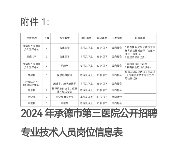本次公开招聘专业技术岗位20名。详见《承德市第三医院招聘专业技术人员岗位信息表》。