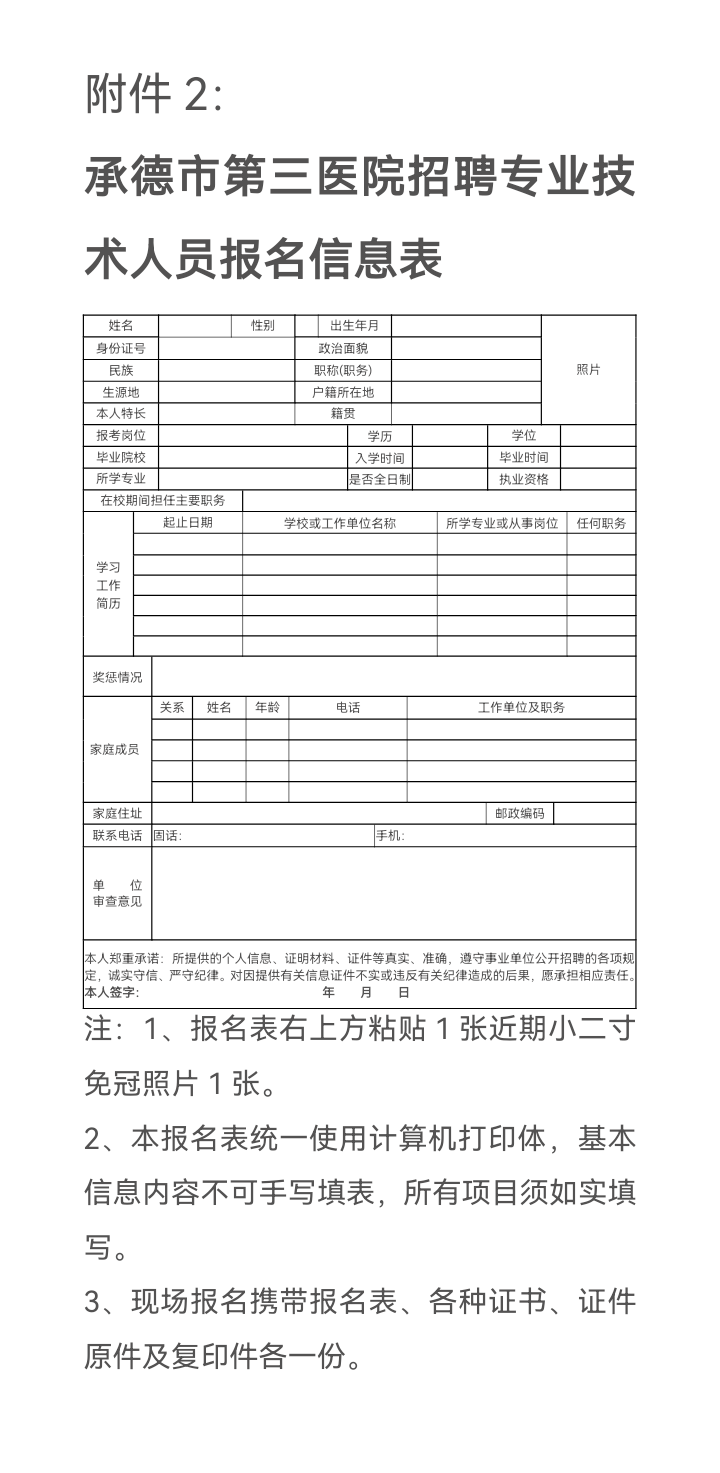 2.报名材料:报名人员需填写《承德市第三医院招聘专业技术人员报名信息表》(附件2),本人身份证、毕业证、学位证、职称证、执业证等有关材料原件和复印件,学信网打印的《教育部学历证书电子注册备案表》。