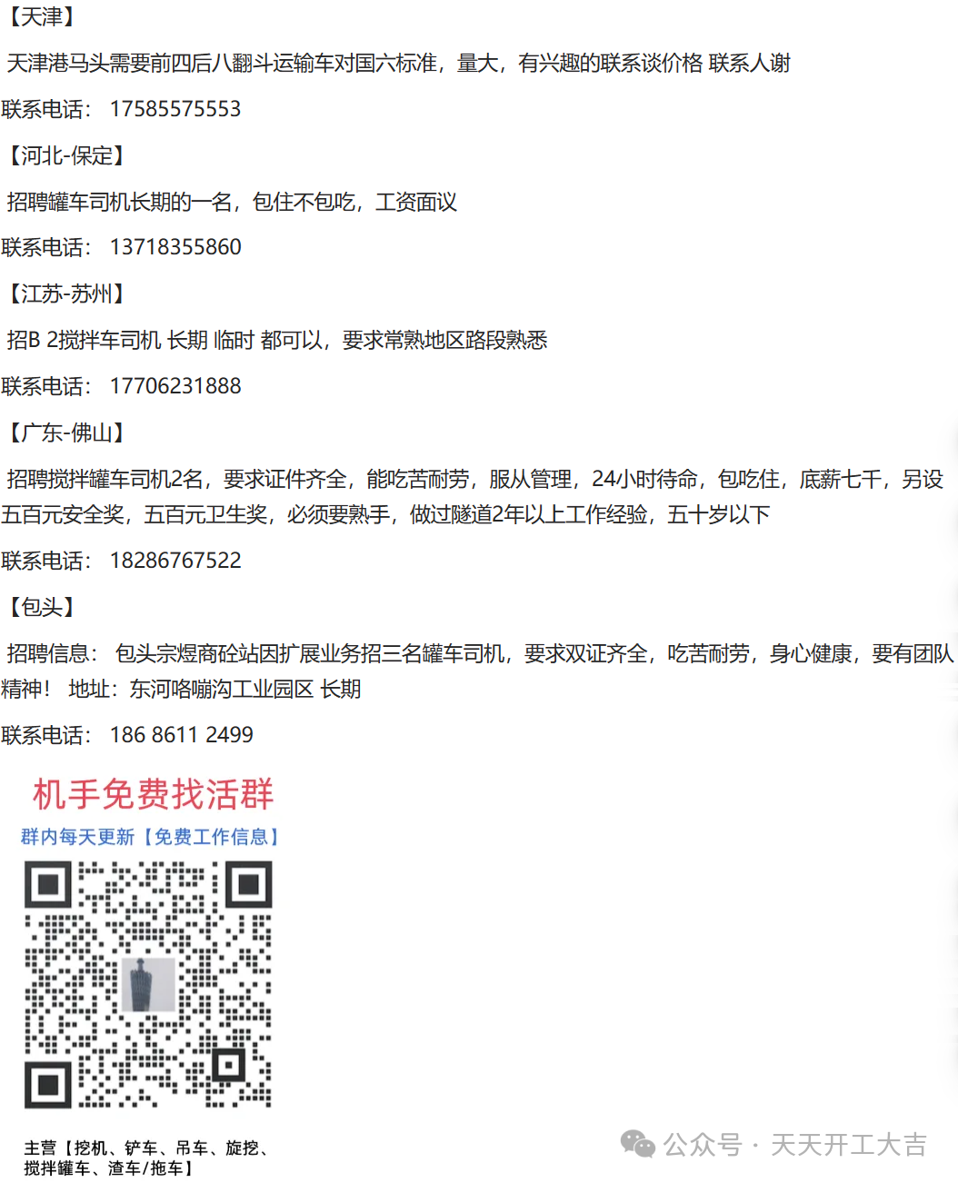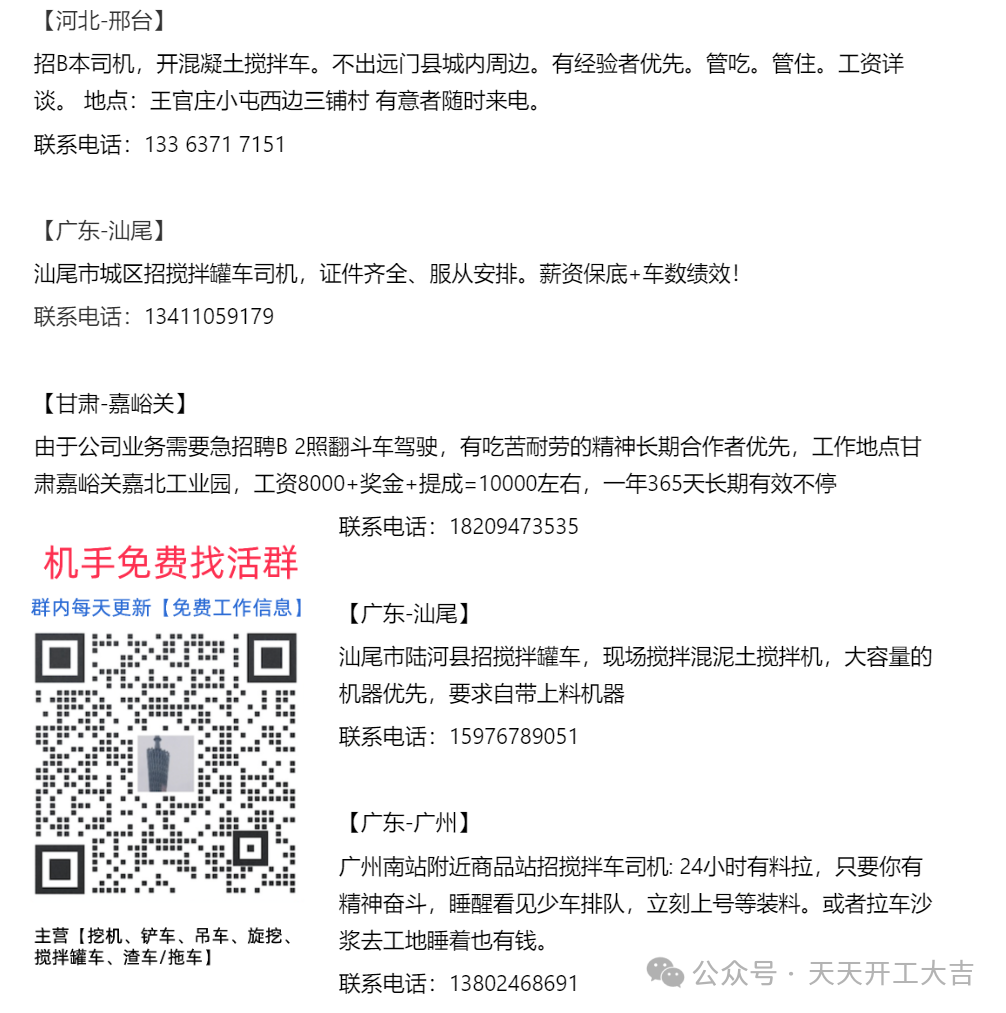 本日共更新B2证司机招聘信息10条,包括前四后八车、拖头泥灌车、搅拌车、渣车、翻斗车等岗位。