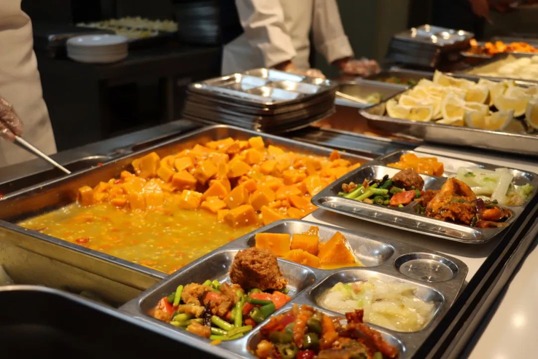 狮子头、麻辣香锅、蒜苗炒大豆芽、杂粮煎饼、泡菜年糕方便面、白米粥、花卷、馒头、米饭