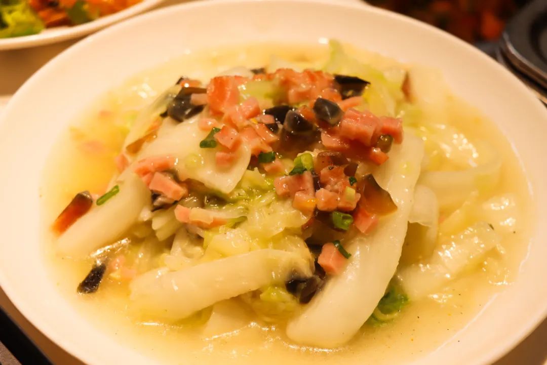 红油榨菜、包菜炒粉条、炝炒三丝、鸡蛋、百吉饼、卤蛋、鸡汤馄饨、蔬菜馒头、花卷