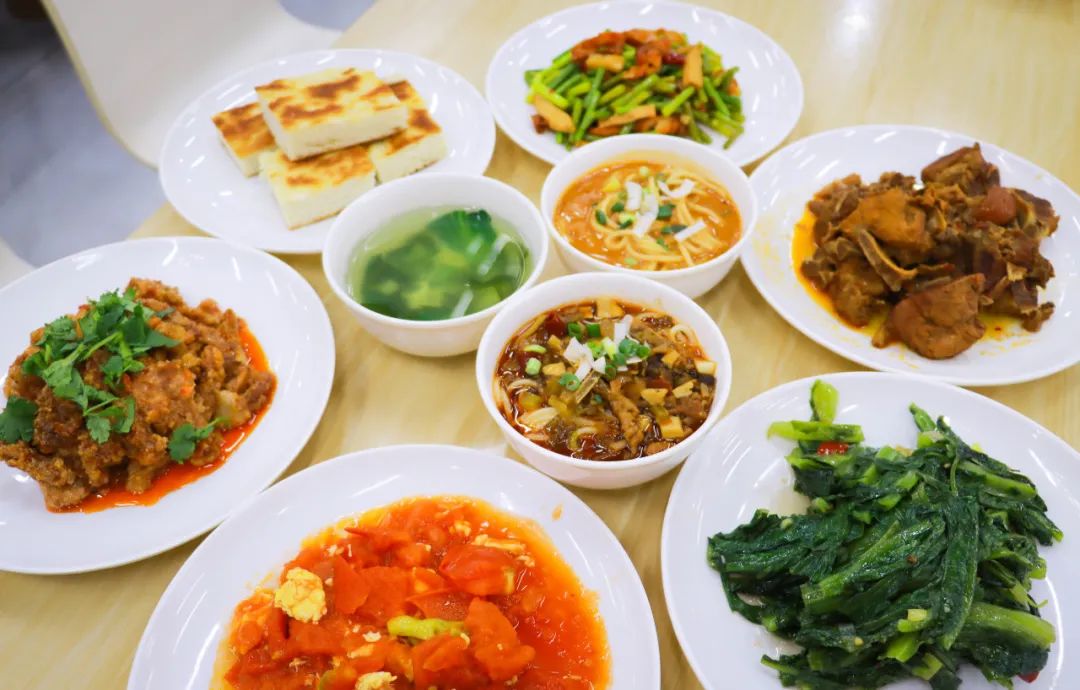 黄焖鸡、粉蒸肉、蒜苔豆干炒肉、麻辣豆腐、干煸青菜、羊血饸络、鸡汤刀削面、蛋花汤圆羹米饭、馒头