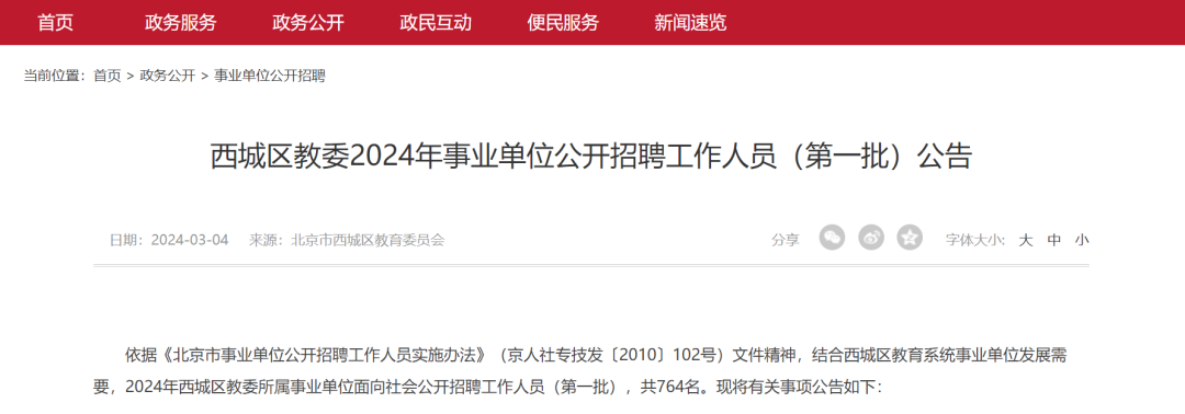 依据《北京市事业单位公开招聘工作人员实施办法》(京人社专技发〔2010〕102号)文件精神,结合西城区教育系统事业单位发展需要,2024年西城区教委所属事业单位面向社会公开招聘工作人员(第一批),共764名。现将有关事项公告如下: