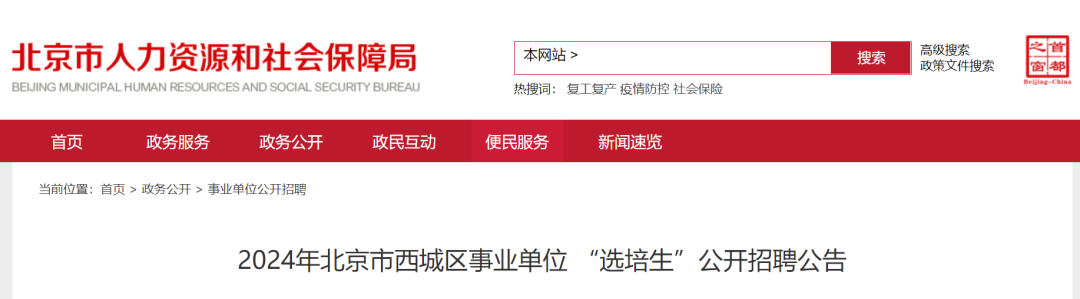 根据《北京市事业单位公开招聘工作人员实施办法》(京人社专技发〔2010〕102号)、《关于进一步规范事业单位公开招聘工作有关问题的通知》(京人社专技发〔2012〕247号)等文件精神,西城区事业单位立足区域战略定位,现面向2024年高校优秀应届毕业生开展首次事业单位“选培生”招聘,本次共招聘15人。有关事项公告如下: