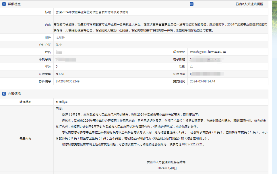 您好!3月8日,您在武威市人民政府门户网站留言,咨询2024年武威市事业单位考试事宜,现答复如下: