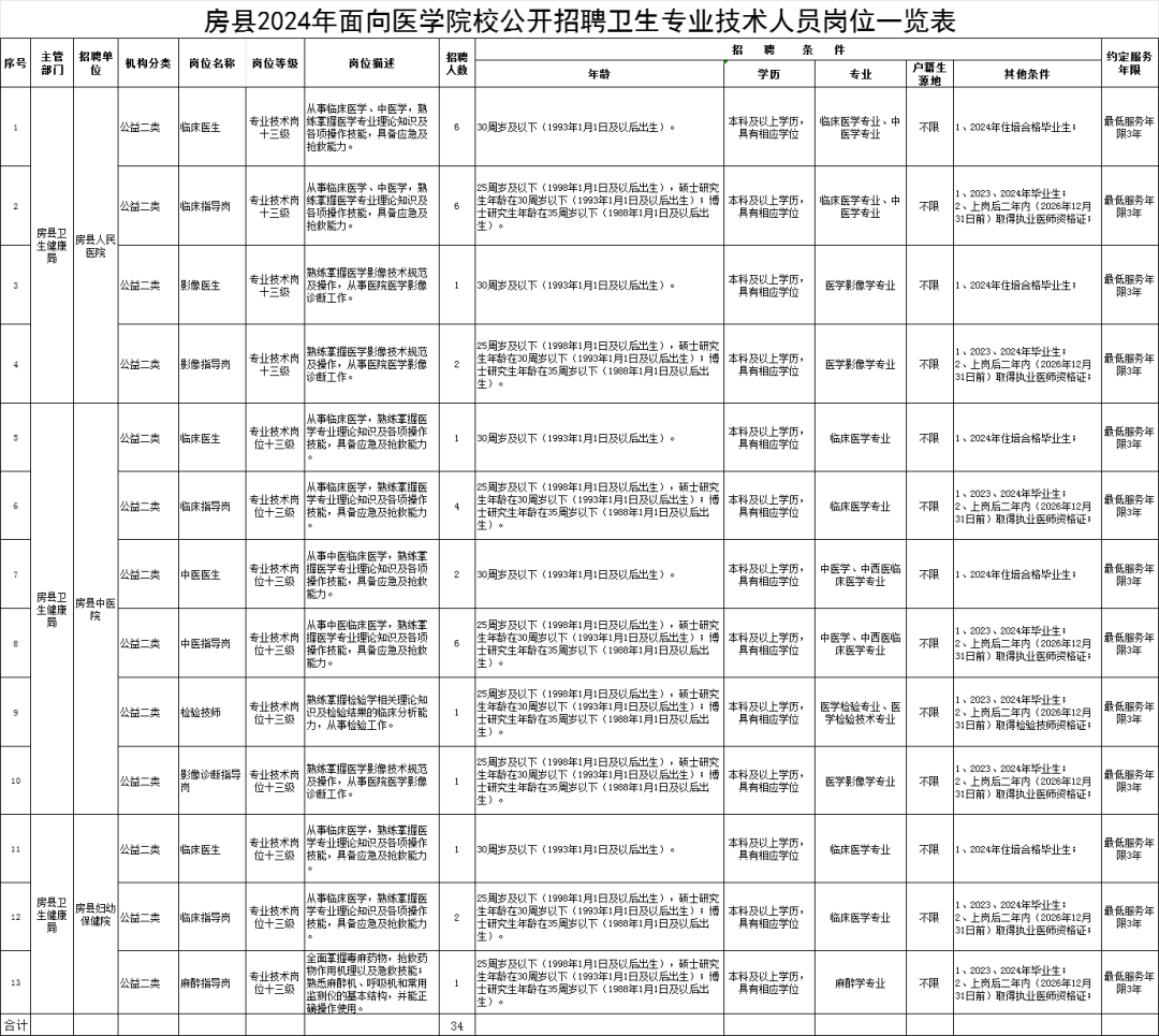 为加强我县卫生健康系统人才队伍建设,根据《事业单位人事管理条例》(国务院令652号)、《事业单位公开招聘人员暂行规定》(人事部令第6号)、中共房县县委机构编制委员会《关于核准全县2024年度基层医疗卫生专业技术人员招聘用编计划的通知》房机编〔2023〕58号,经县委、县政府批准,房县拟面向医学院校公开招聘34名卫生专业技术人员。现将有关事项公告如下:坚持公开、平等、竞争、择优的原则;坚持任人唯贤、德才兼备的用人标准;本次招聘采取直接面试与考察等程序相结合的方式进行。详见《房县2024年面向医学院校公开招聘卫生专业技术人员岗位一览表》(附件1),以下简称《岗位表》。