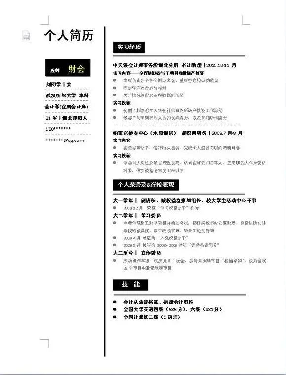 所以:1.有实习经验的,要实习经验写在前面,再写校园活动经历 和获奖证书