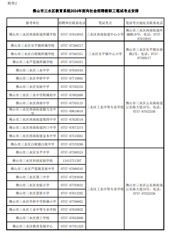 现将佛山市三水区教育系统2024年面向社会招聘教职工笔试考生名单予以公布(见附件1),笔试时间为2024年3月23日上午10:00-11:30(9:30开始签到,10:30后禁止进场)。考生须凭本人身份证(或社保卡、驾驶证之一)参加笔试,考生不需打印准考证,但需记住准考证号(见附件1)。请进入笔试环节的考生按照本人报考单位,到对应的考点参加笔试(考点安排见附件2)。如有疑问请及时与工作人员联系,联系电话:0757-87709870;0757-87701328。