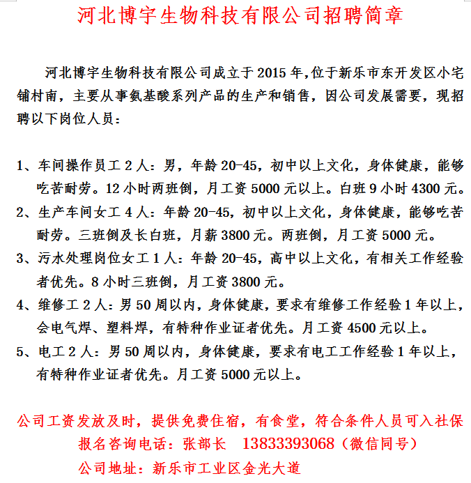 河北博宇生物科技有限公司成立于2015年,位于新乐市东开发区小宅铺村南,主要从事氨基酸系列产品的生产和销售,因公司发展需要,现招聘以下岗位人员:1、车间操作员工6人:男,年龄20-45,初中以上文化,身体健康,能够吃苦耐劳。12小时两班倒,月工资5000元以上。白班9小时