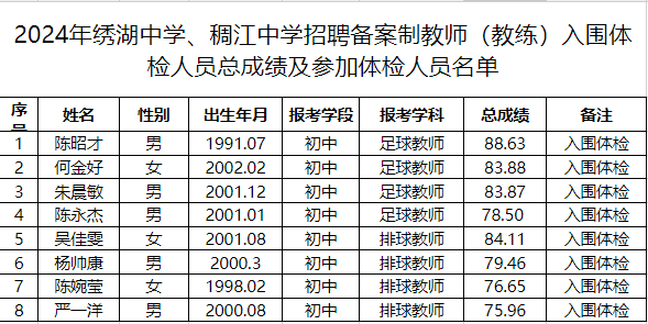 根据《2024年义乌市绣湖中学、稠江中学招聘备案制教师(教练)公告》,经公开报名、资格审核、考试等程序,现将入围体检人员总成绩、参加体检对象和入围体检人员体检的有关事宜公告如下: