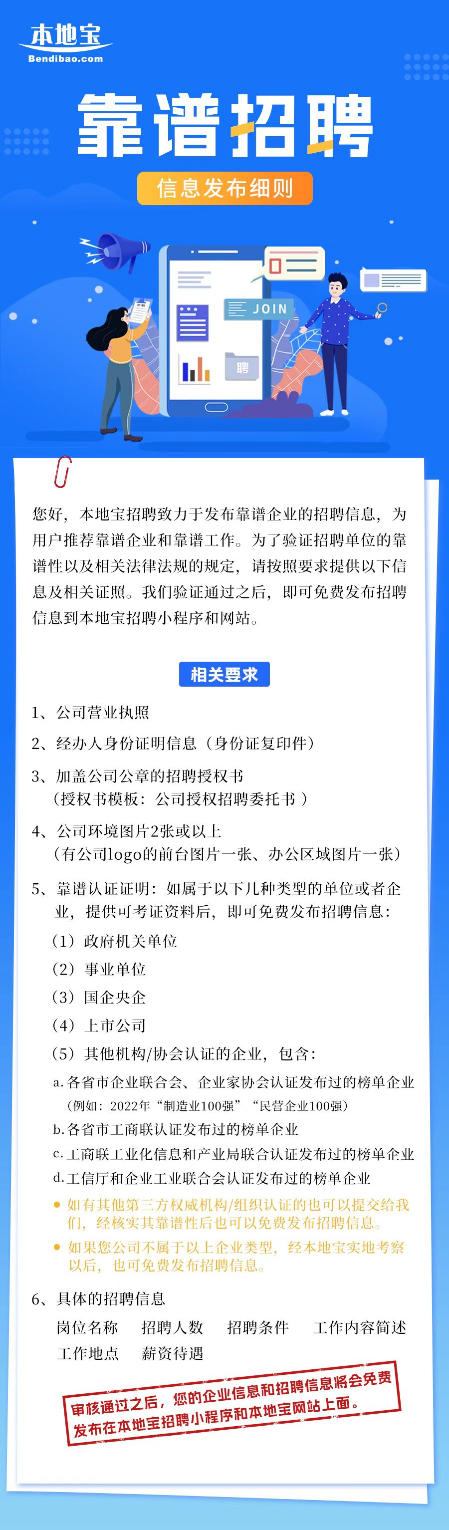 是免费的,在本地宝招聘上发布的所有职位均免费,对于发布的岗位数量也是没有限制的,未来发布的职位会在本地宝网站、本地宝小程序展示,优质的招聘岗位会在本地宝微信公众号展示。
