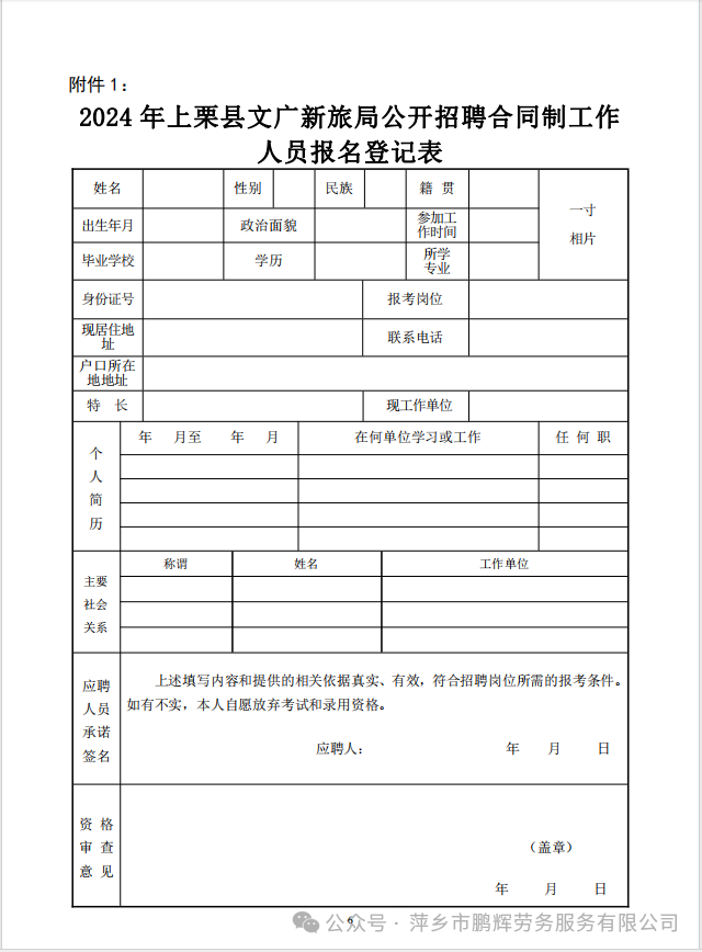 附件1:《2024年上栗县文广新旅局公开招聘合同制工作人员报名登记表》;