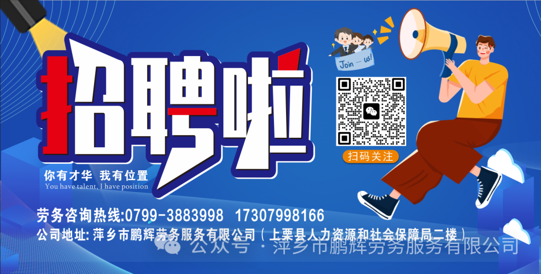 温馨提示:由于微信修改了推送规则,没有经常点“在看”的,会慢慢收不到推送。如果你还想看到我们发布的招聘信息,请将“萍乡市鹏辉劳务服务有限公司”加为星标,每次看完后别忘记点下“赞”“在看”。