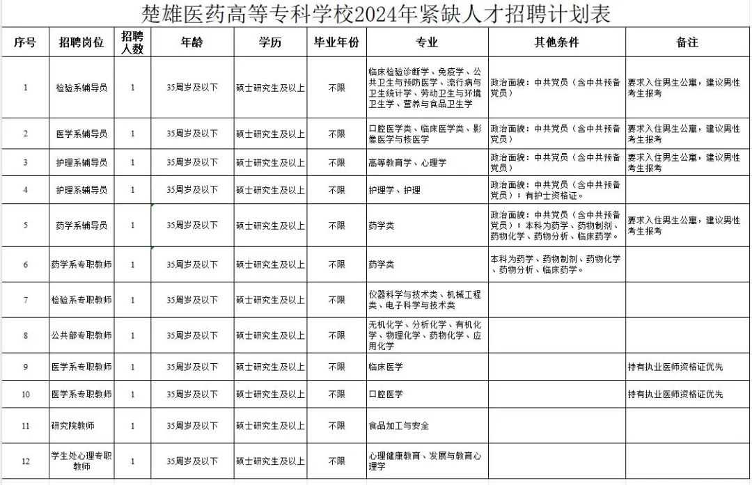 面向全国招聘12名普通高等院校硕士研究生及以上学历毕业生。(招聘岗位详见附件1《楚雄医药高等专科学校2024年紧缺人才招聘计划表》)