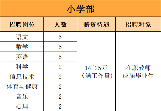 从教师招聘职位表来看,学校此次招聘的岗位数量较多,其中小学部招聘25人,初中部招聘42人,高中部招聘38人。