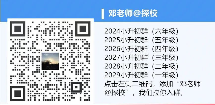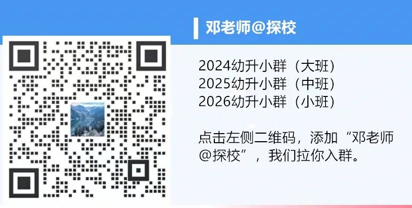 私家探校已为幼升小、小升初家长建立了“幼升小群”和“小升初群”。欢迎家长添加“邓老师@探校”,我们拉你入群。