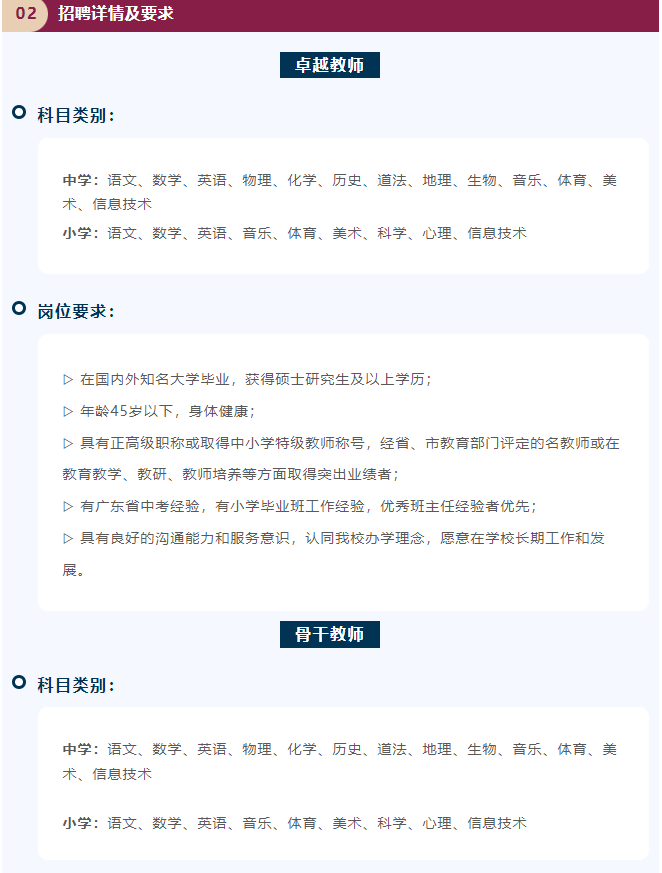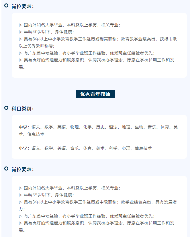 从招聘详情及要求来看,学校正在招聘中学及小学的骨干教师、青年教师等职位。