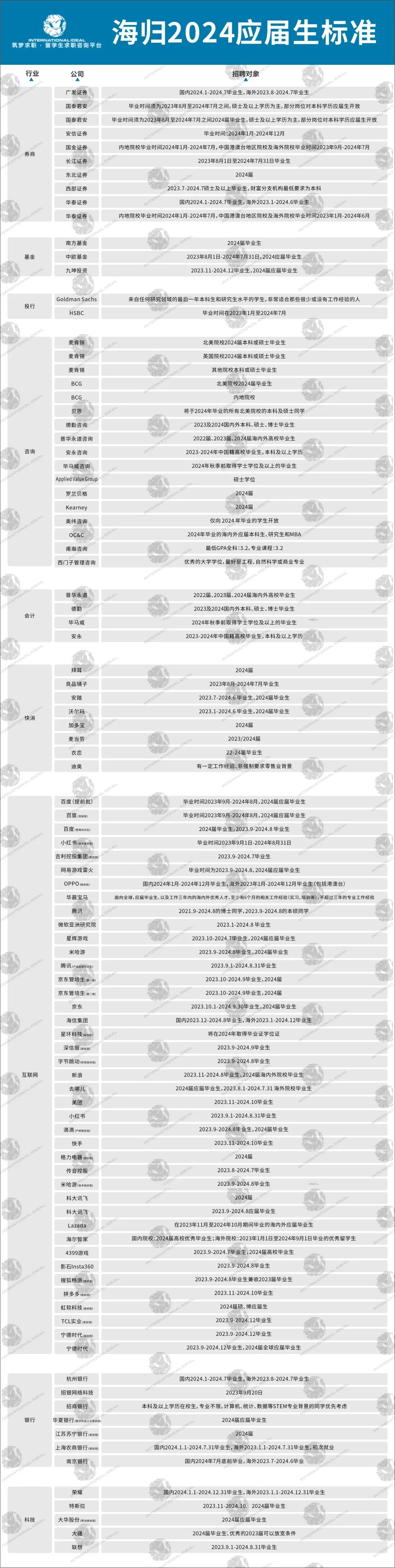 小i也为大家整理了不同公司2024秋招对于海归毕业时间的要求(图片较长,请自行滑动或点击大图)👇另外,相比本土的应届生,海归的优势在于国际视野、语言优势等等,而弱势就在于长居海外,对国内的招聘流程比如笔试、面试不熟悉,从而失去求职竞争力。