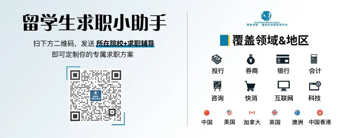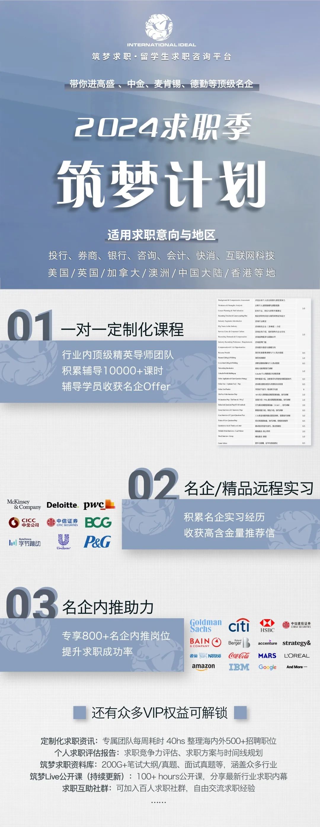 筑梦求职 INTERNATIONAL IDEAL ,2014 年成立于美国,是北美最早成立的留学生求职咨询平台之一。我们是宁波人才服务中心战略合作伙伴,并荣登福布斯全球华人精英TOP100及胡润百富创业领袖榜单,至今已帮助 8000+ 学员获得来自 Goldman Sachs, McKinsey, Deloitte, P&G 等企业 offers。我们的服务包括:求职咨询、背景提升、名企内推、海内外招聘等;商务合作请联系:Coop@internationalideal.com