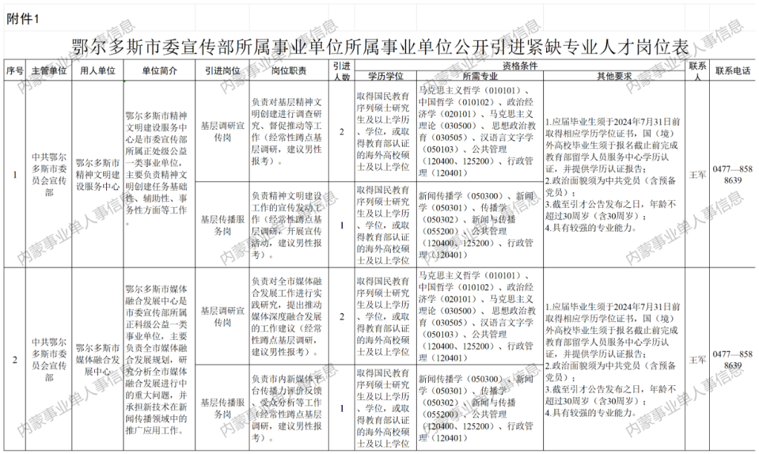 附件:1.《鄂尔多斯市委宣传部所属事业单位所属事业单位公开引进紧缺专业人才岗位表》