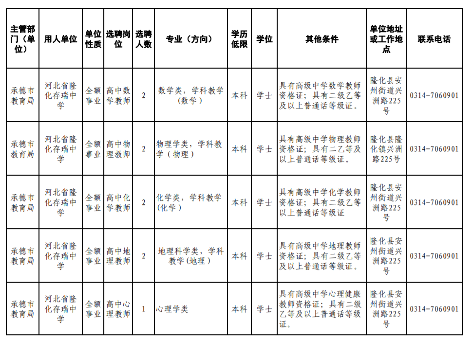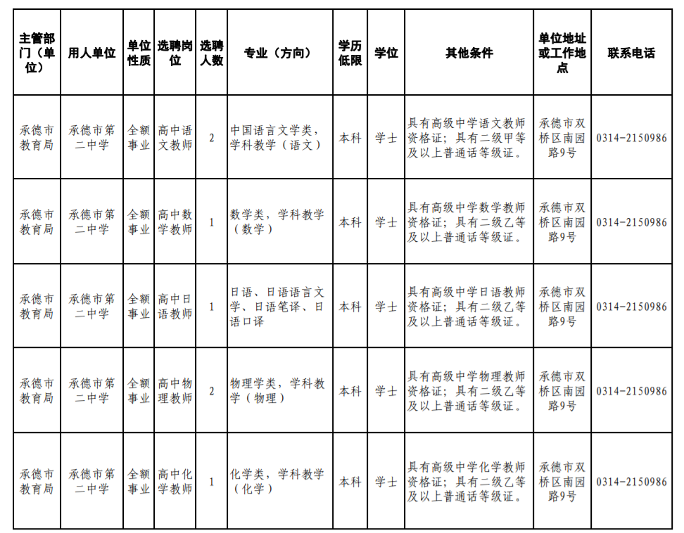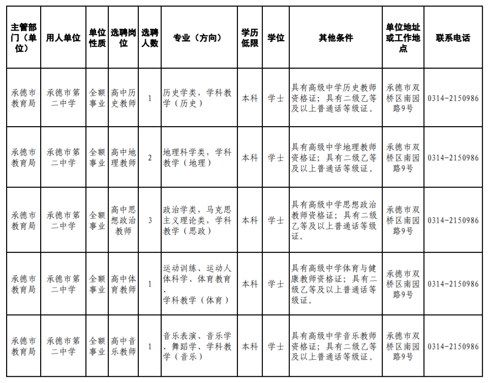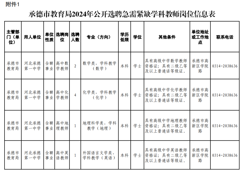 为进一步优化教师队伍结构,提高直属重点高中学校师资水平,提升教育教学质量,满足学校教育教学需求,根据市委、市政府《关于加快推进基础教育高质量发展的实施意见》(承发〔2023〕5号)和市委组织部、市人社局关于印发《承德市事业单位公开招聘工作人员暂行办法》(承人社〔2011〕87号)、《承德市事业单位选聘高层次和急需紧缺人才暂行办法》(承人社字〔2014〕23号)等文件要求,决定面向省级及以上重点师范类院校、“双一流”院校公开选聘急需紧缺学科教师。现将有关事项公告如下: