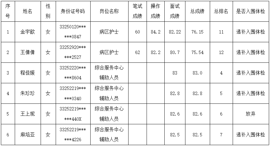 根据《2024年青田县人民医院招聘编外聘用人员公告》规定,若招聘职位一年内(2025年1月29日)有辞职、辞退等原因出现职位空缺的,可根据本次招聘该职位总成绩排名由高到低的依次递补直接进入体检、考察程序。现将递补入围体检人员名单予以公布。