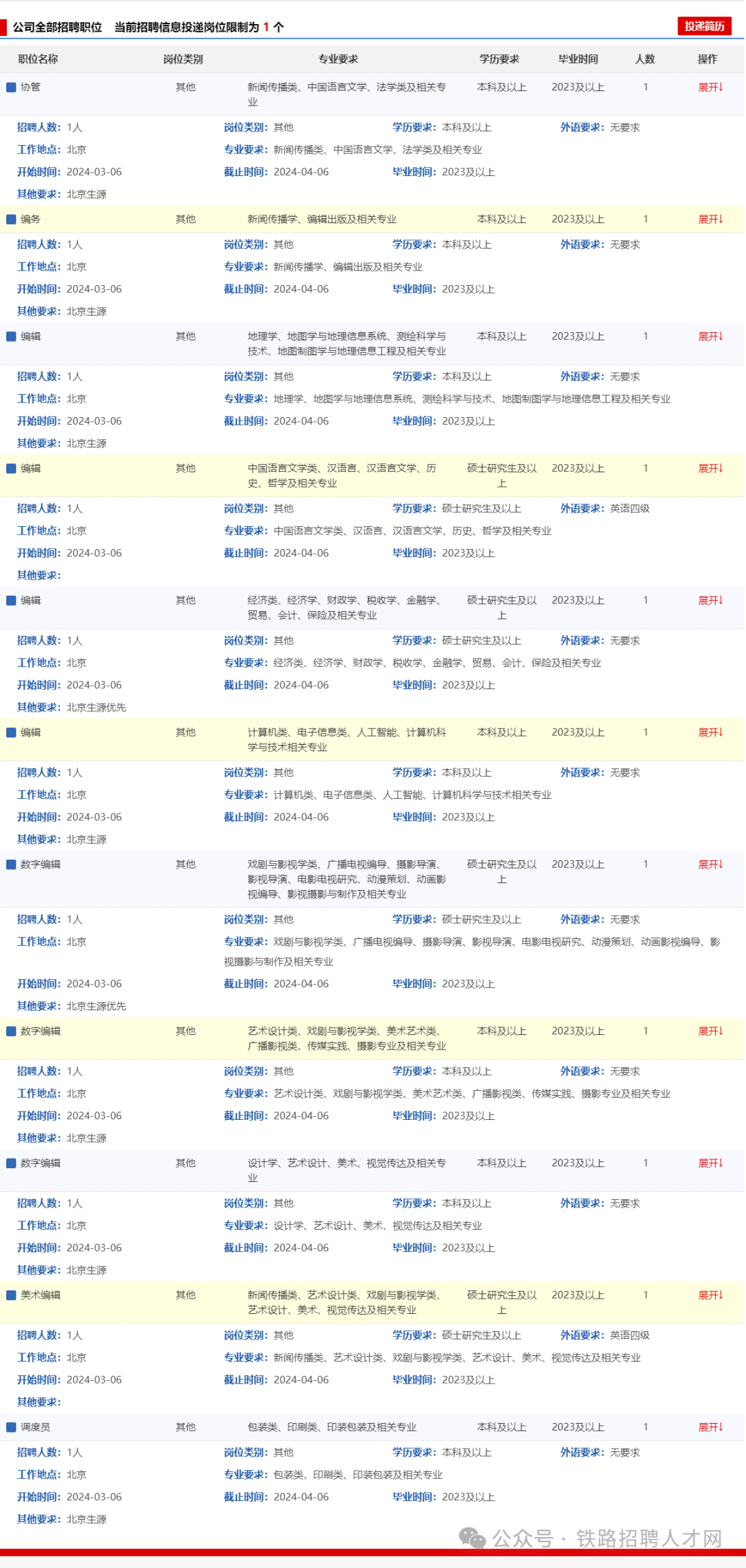 (二) 政治立场坚定,拥护中国共产党领导和社会主义制度,深刻领悟“两个确立”的决定性意义,增强“四个意识”,坚定“四个自信”,做到“两个维护”,在思想上政治上行动上同以习近平同志为核心的党中央保持高度一致,有志投身中国铁道出版文化事业。(四)学习成绩优良,按时取得相应的学历、学位证书,符合岗位所需的专业条件和任职要求。(五)纳入国家统一招生计划,在校期间为非在职的2024年应届高校毕业生及经教育部留学服务中心认证的留学回国人员。毕业生须在报到时取得国家认可的毕业证和学位证。其中:对毕业后户口、档案、组织关系仍保留在原毕业学校,或保留在各级毕业生就业主管部门(毕业生就业指导服务中心)、各级人才交流服务机构和各级公共就业服务机构,且至今未与其他单位建立劳动关系的2023年高校毕业生,可以按照2024年应届毕业生身份参加应聘。(六)适应岗位所需的身体条件和心理条件,在我单位指定的体检机构体检合格,能够适应应聘岗位工作要求。3. 曾在各级公职人员招考中被认定有舞弊等严重违反考试录用纪律行为的;二、招聘计划