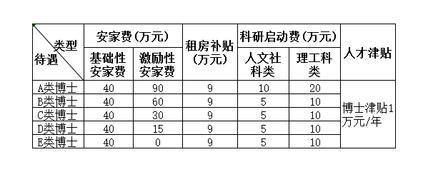 说明:①具有正高职称的博士和具有副高职称的博士、博士后出站人员安家费分别比照同类博士的基础性安家费增加10万元和5万元;