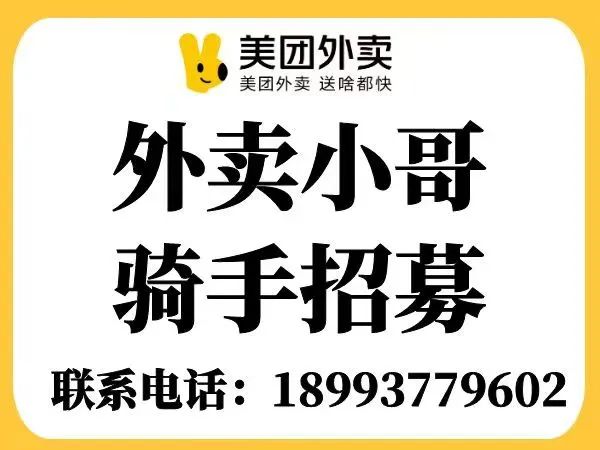 美团外卖招聘美团骑手啦 新政策【日结骑手,每天保底100元!!】欢迎咨询年龄18-55周岁,身体健康,需办理健康证,有师傅带教,入职当天即可单独跑单,工作轻松简单;门槛低、工资高,上手快!8000-15000+ 、高付出高回报、上不封顶‼联系方式:王经理 18993779602 (王经理:18993779602)