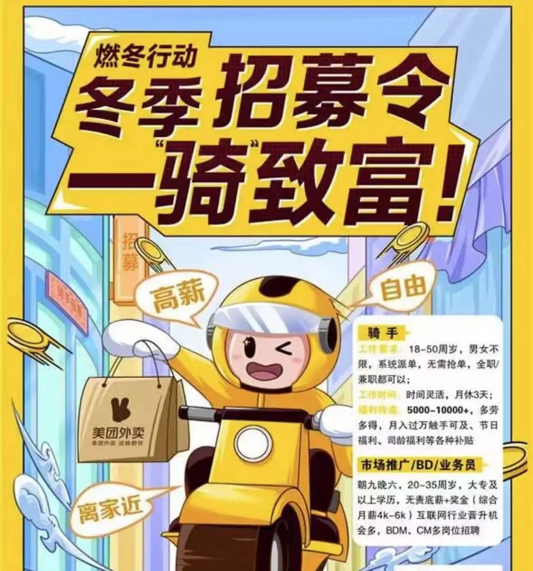 美团直聘骑手🎉🎉🎉工资待遇:一般干:6000~7000努力干:8000~9000加班干:12000以上工作要求:1.18-48岁,会骑电动车,会看手机导航,无犯罪记录;2.新人入职师傅免费带3.高低温补贴,恶劣天气补贴;只要你肯来,你的工资你决定!联系电话:王女士 13079301209(微信同号) (王女士 :13079301209)